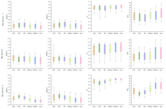Figure 4 presents boxplots of all evaluation metrics for each test sample across three datasets using different methods. For the error metrics in the time and frequency domains, the sample distributions of all methods are relatively concentrated, while our method exhibits a lower mean and smaller variance, further demonstrating the stability of the proposed model in error control. Regarding the CC metric, comparative methods show significant fluctuations, whereas our model maintains a more compact distribution, reflecting more consistent signal recovery capability. In terms of the output SNR, especially in EOG Dataset 1, our method exhibits a higher signal-to-noise ratio, indicating that the proposed method can effectively remove artifacts.