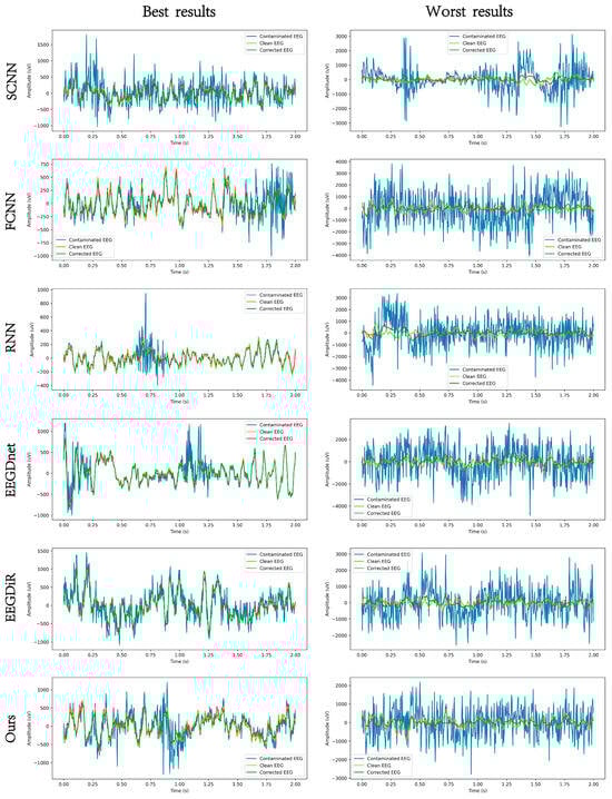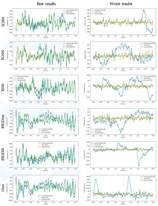 Figure 5 and Figure 6, respectively present the comparison results before and after artifact removal on EOG Dataset 1 and the EMG dataset. The figures display the best (highest correlation, left column) and worst (lowest correlation, right column) denoising waveforms achieved by different deep learning methods. It can be observed that all types of deep learning approaches are capable of effectively removing artifacts and reconstructing the target EEG signals. The samples in the left column represent EEG signals with higher SNR, while those in the right column have lower SNR. As shown in the figures, denoising results are clearly better in the high-SNR cases, indicating that SNR has a strong impact on denoising performance. The performance of all methods improves with increasing SNR. Under low SNR conditions, our method still maintains a relatively accurate trend and amplitude, effectively suppressing low-frequency drift characteristics and well preserving the intrinsic structure of EEG signals. Figure 7 and Figure 8 show the artifact removal results of the same data segment from EOG Dataset 1 and the EMG Dataset using different methods. It can be observed that our method demonstrates a relatively balanced performance in terms of signal smoothness and structural preservation.