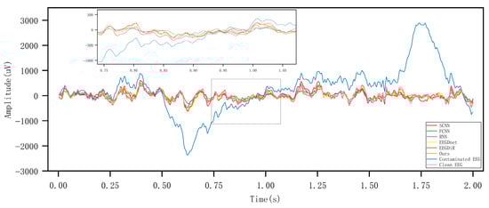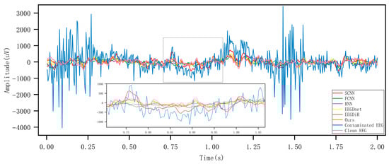 Electroencephalography (EEG) is an electrical signal generated by neural activity in the brain and recorded through scalp sensors [1]. Due to its non-invasiveness, portability, and affordability, it has been extensively used in brain activity recognition [2,3], BCI EEG decoding [4,5], epilepsy detection [6], and more. However, EEG signals are highly vulnerable to physiological interferences such as electrooculography (EOG) and electromyography (EMG) and may even be overwhelmed by noise. This can significantly impact health monitoring [7,8], the assessment of driver microsleep states [9,10,11], and the diagnosis of brain disorders, as well as the accuracy and performance of BCI EEG decoding [12]. Therefore, effectively removing physiological artifacts and recovering clean signals has become a key challenge in EEG signal preprocessing.