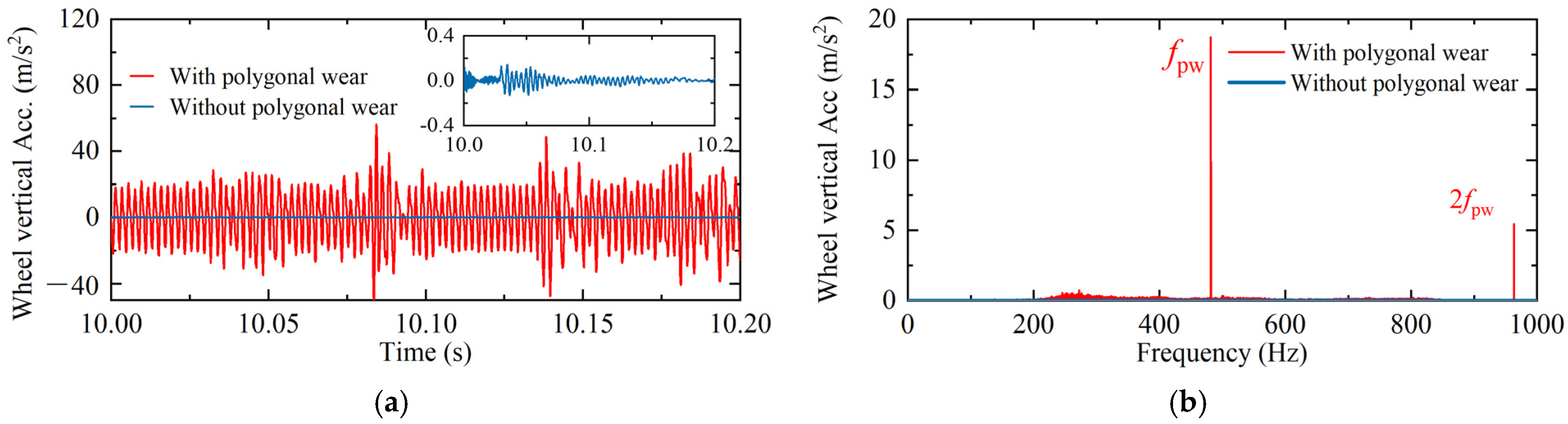- Song, Z.; Wang, F.; Hu, X.; Cheng, D.; Li, Q. Influences of wheel polygon amplitude on wheel-rail vibration and sound radiation. J. Low Freq. Noise Vib. Act. Control. 2023, 42, 477–495. [Google Scholar] [CrossRef]