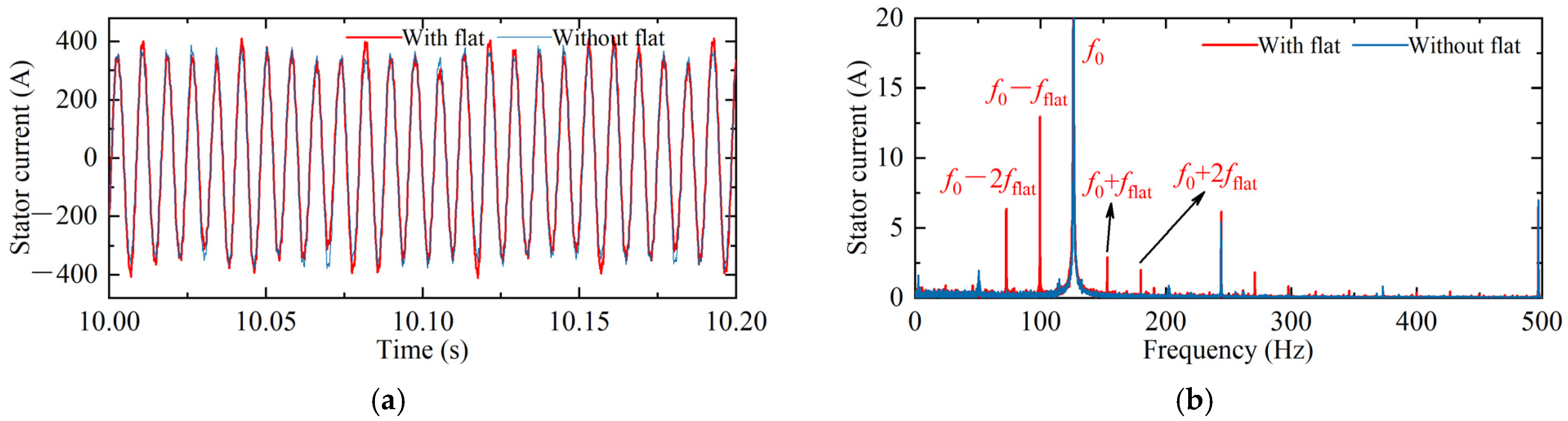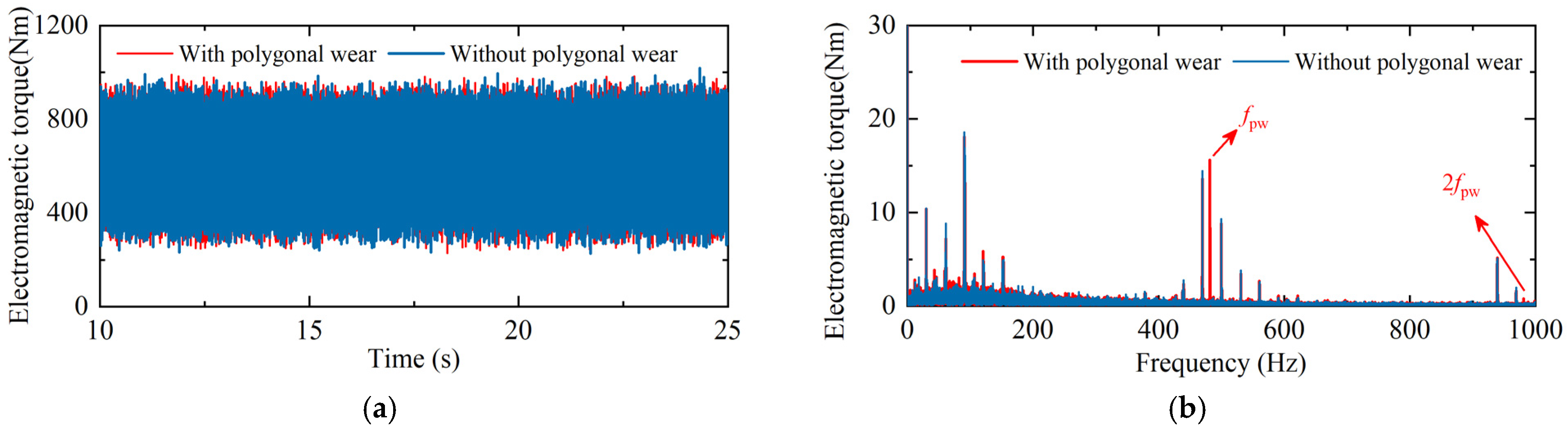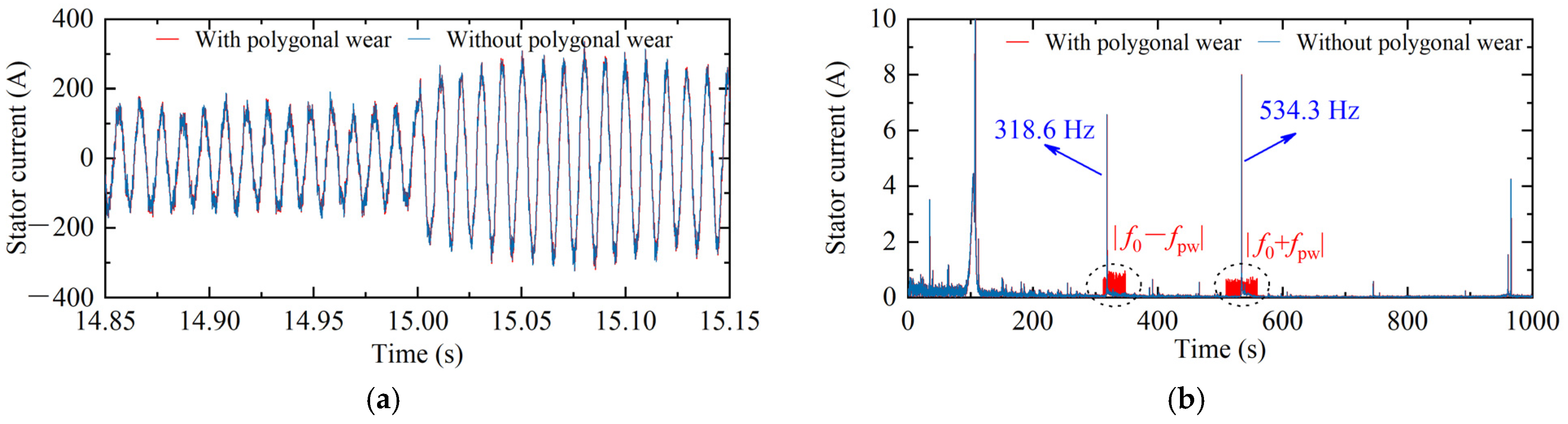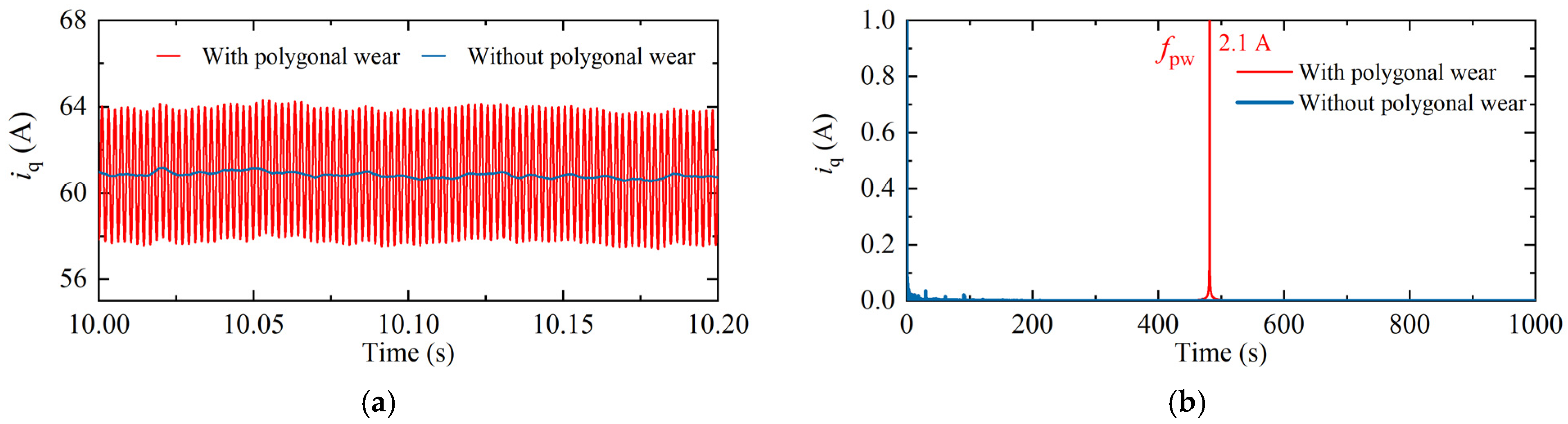 - Wheel irregular wear—such as wheel polygonal wear and wheel flats—induces wheel–rail vibration excitations that can propagate into the electrical drive system. These excitations couple with the motor fundamental frequency and generate harmonics and harmonic torque components.