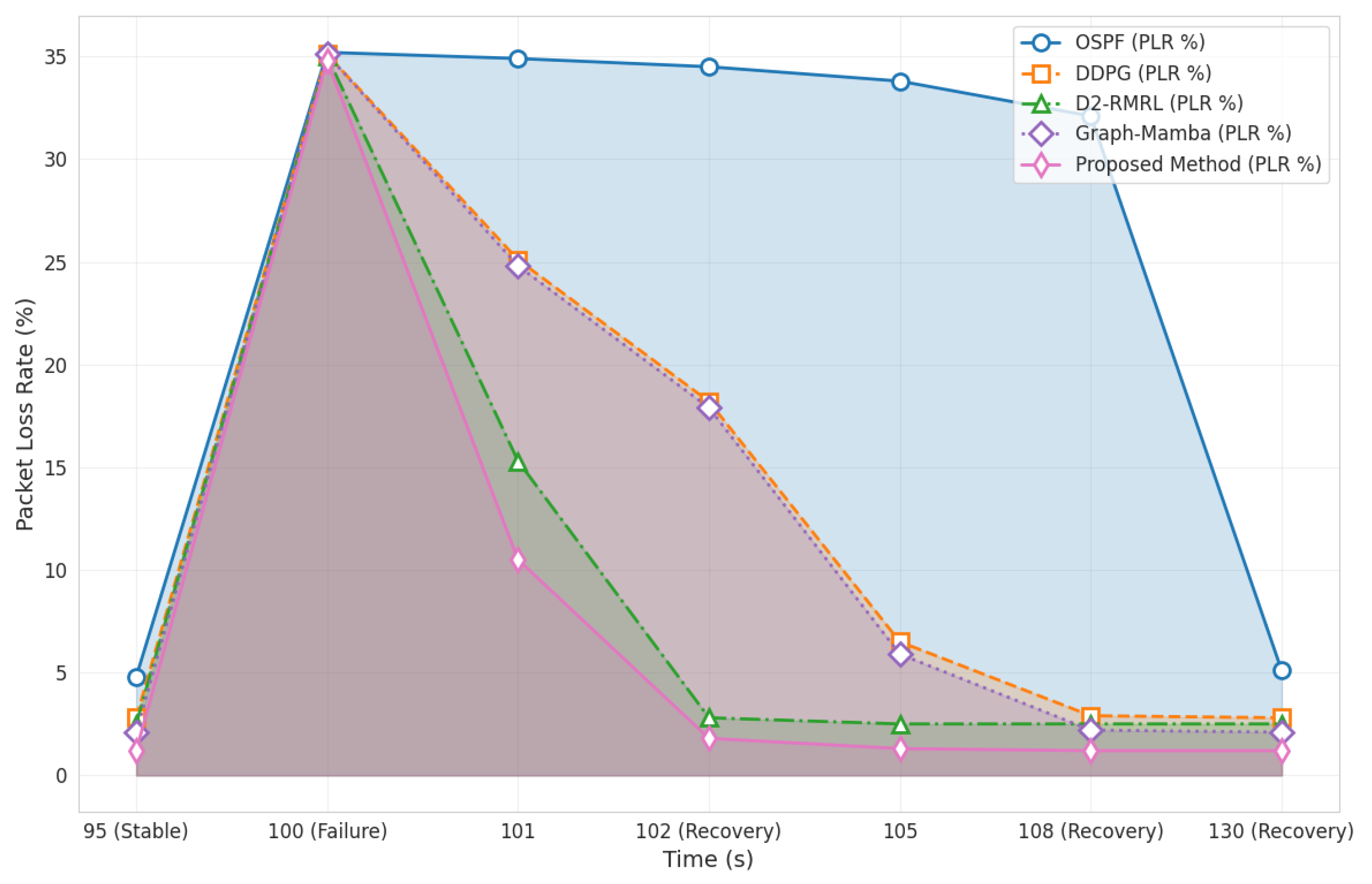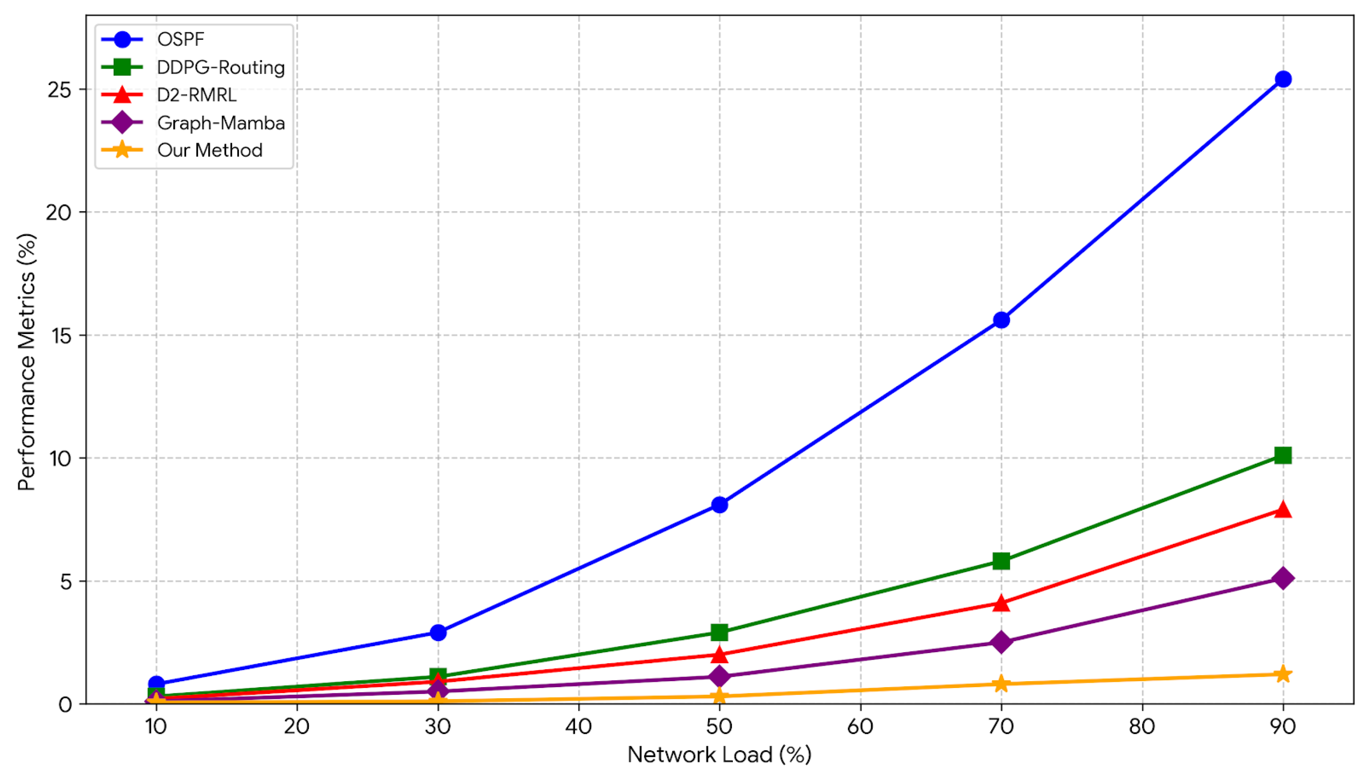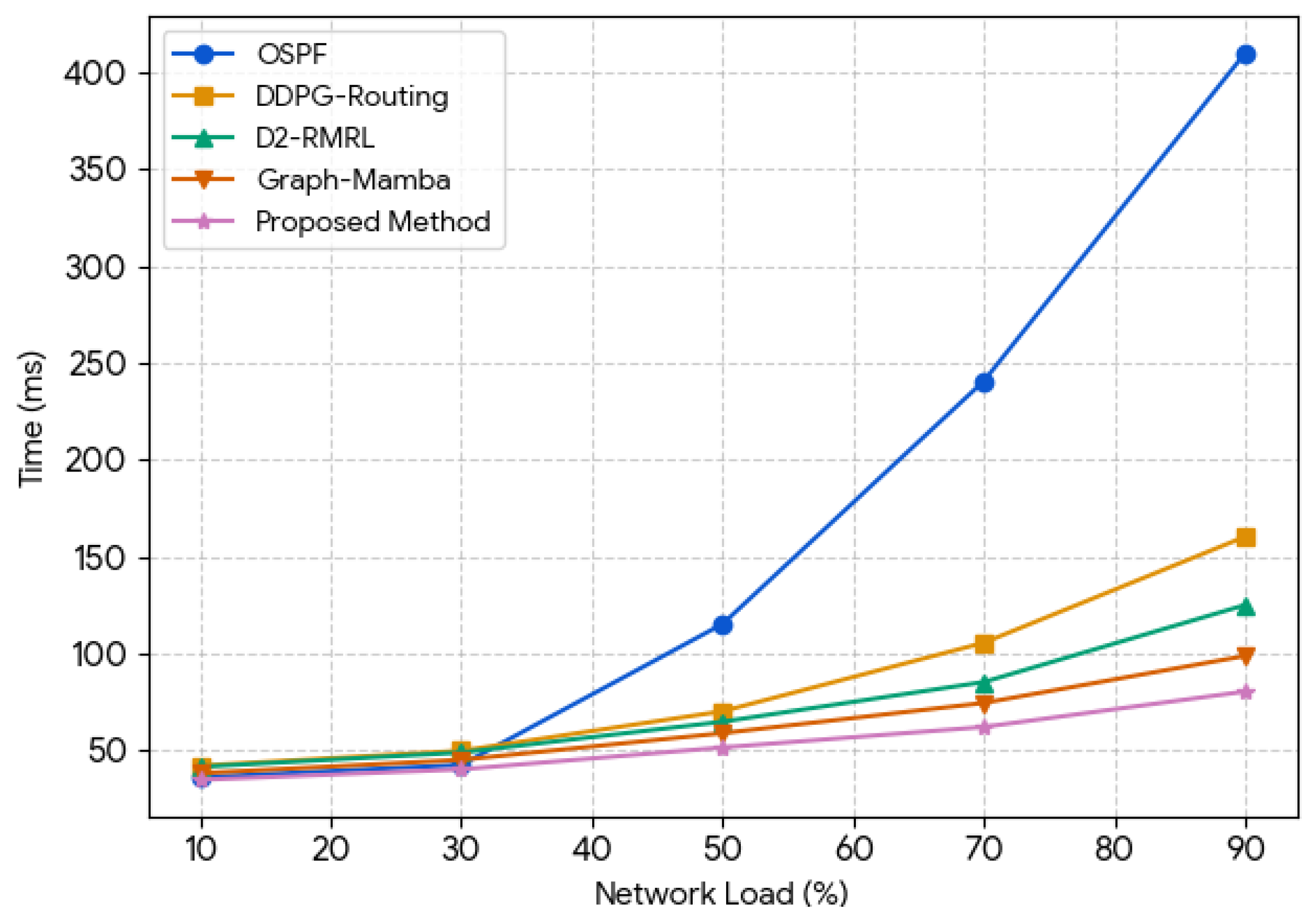| Network Load (%) | OSPF (ms) | DDPG-Routing (ms) | D2-RMRL (ms) | Graph-Mamba (ms) | Proposed Method (ms) |