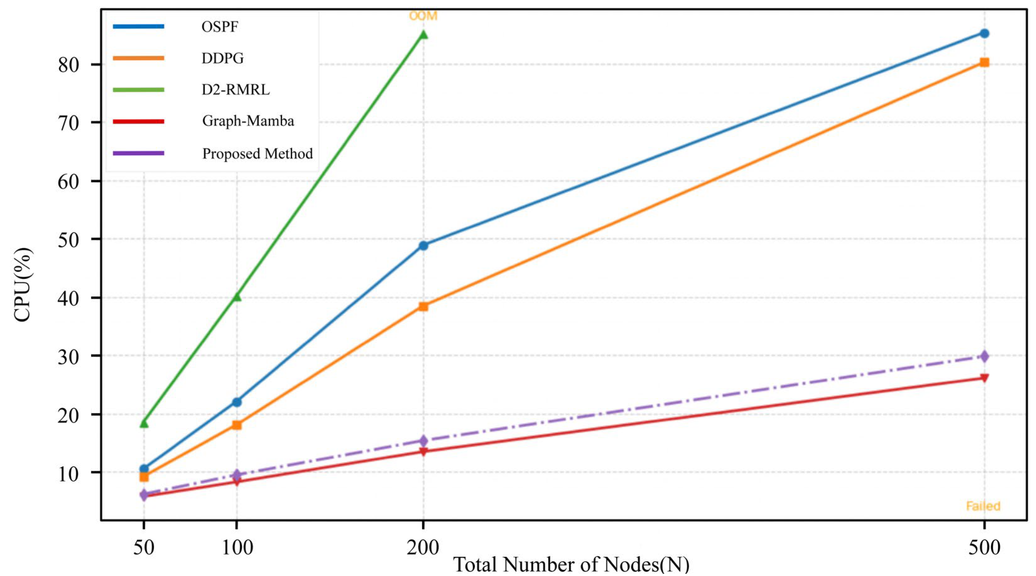 | Total Number of Nodes (N) | OSPF (CPU %) | DDPG (CPU %) | D2-RMRL (CPU %) | Graph-Mamba (CPU %) | Proposed Method (CPU %) |