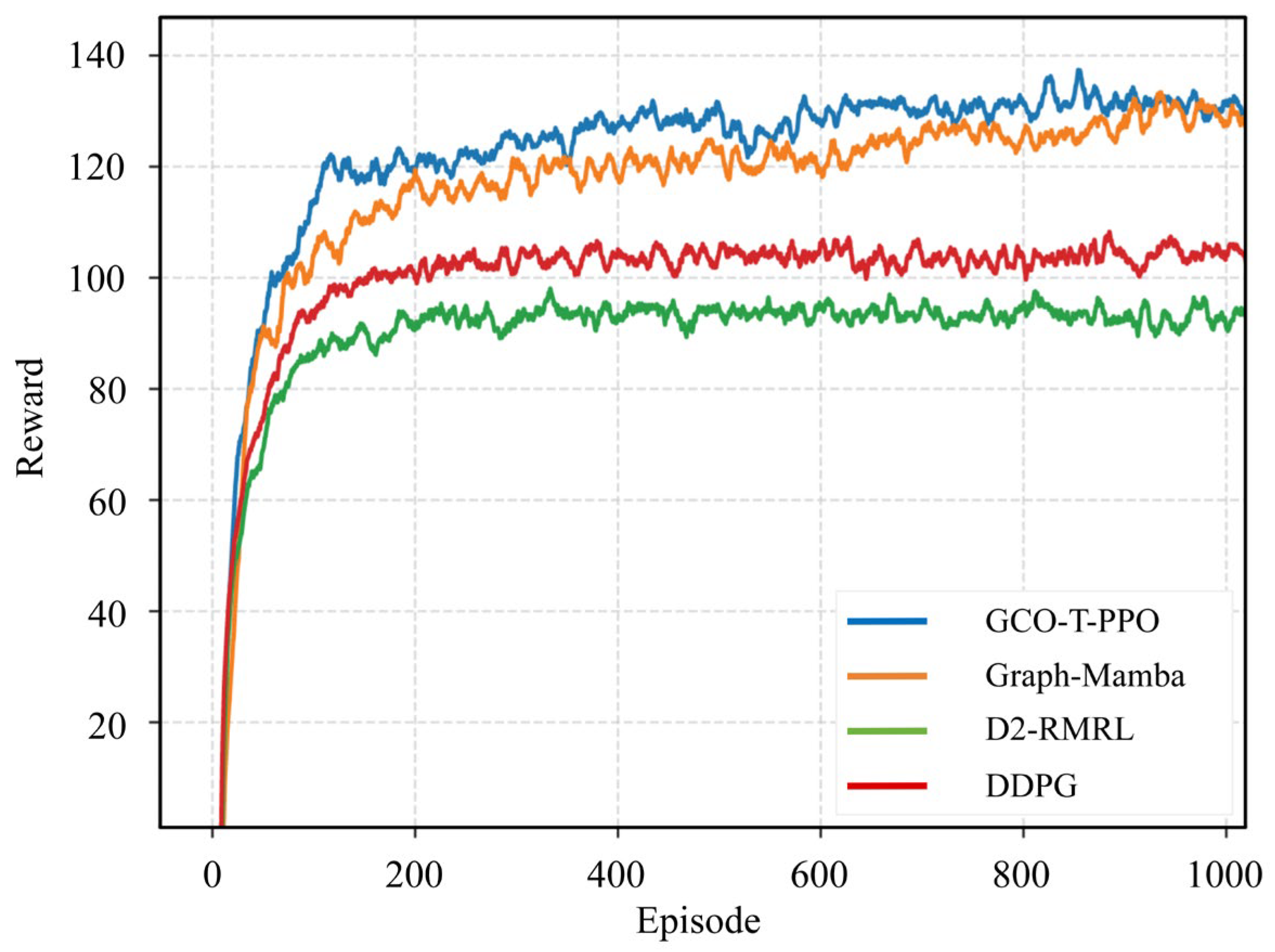 - Graph-Mamba-Routing (SOTA GNN Baseline): To fairly compare the effectiveness of our GCN-Transformer encoder, we introduce a baseline based on the 2024 SOTA GNN architecture. This algorithm uses a Graph-Mamba encoder instead of our GCN-Transformer. Mamba (a state space model, SSM) is a major competitor of the Transformer in long sequence modeling, theoretically having equivalent sequence modeling capability and higher computational efficiency. The decision-making end of this baseline also uses PPO to ensure fair comparison, thereby isolating the performance differences of encoders (GCNT vs. Graph-Mamba).