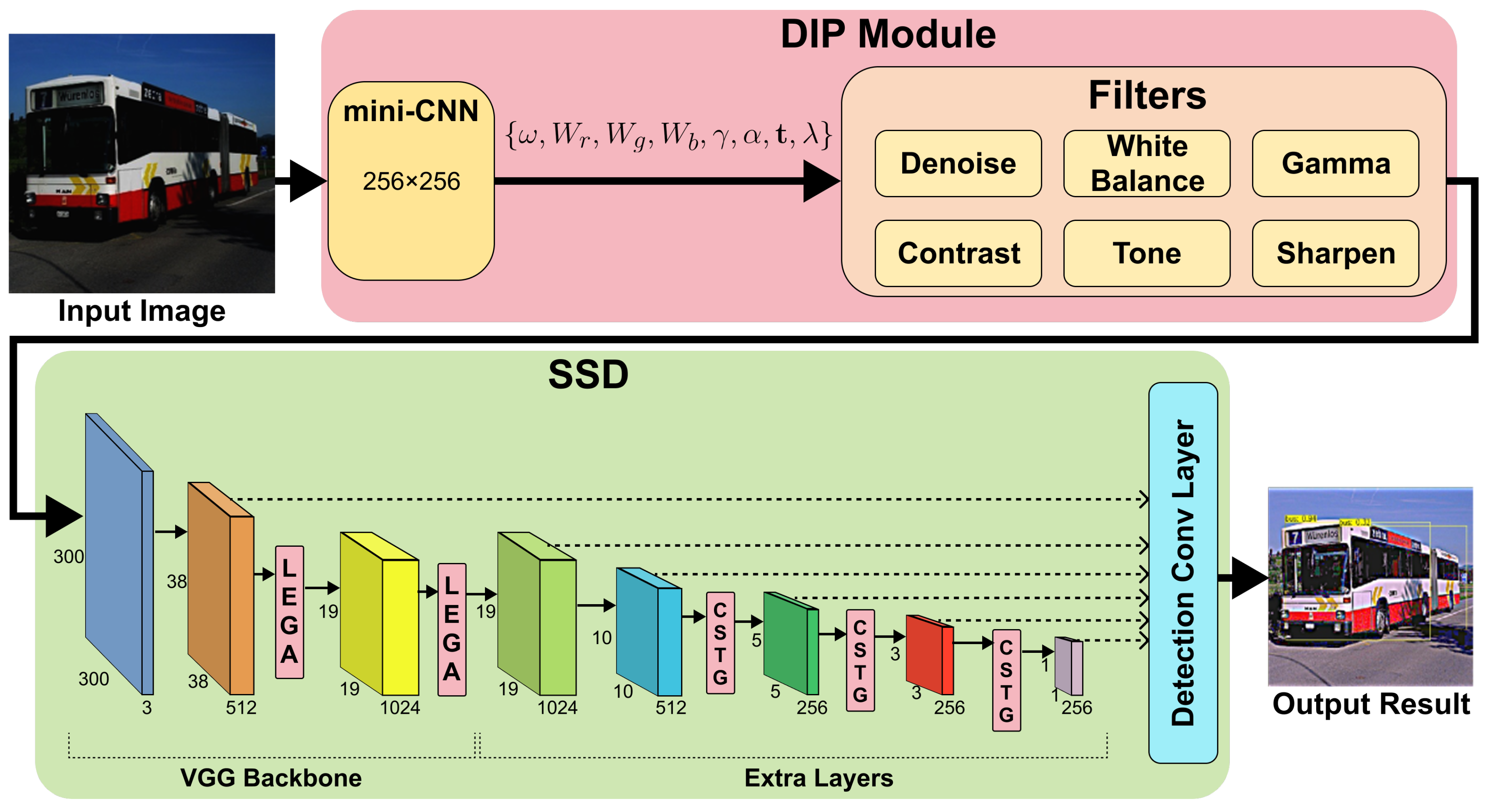 First, the DIP module applies differentiable filters using the parameters predicted by the mini-CNN, and the resulting enhanced image is then transmitted to the subsequent SSD backbone and extra layers. Since the DIP parameter is fine-tuned to enhance object detection performance rather than a fixed rule-based transformation, the entire image quality improvement process is optimized as a task-driven process. The LEGA module highlights structural boundary cues in the backbone’s show stage, improving the ability to detect small objects and blurry boundaries, and CSTG performs global context-based refinement and content-based gating in extra layers to enhance feature alignment and semantic separation across scales.