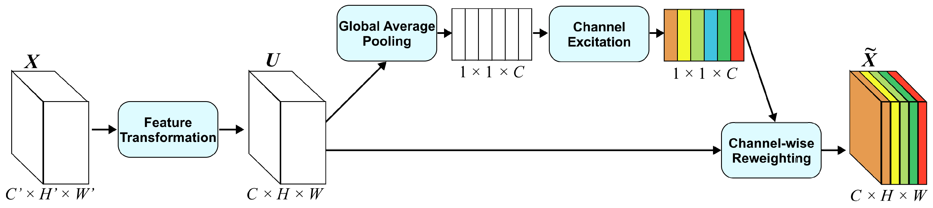 30]. SEBlock summarizes the average response across the entire space and reweights the semantic importance of each channel, thereby suppressing noise channels and enhancing meaningful channels.