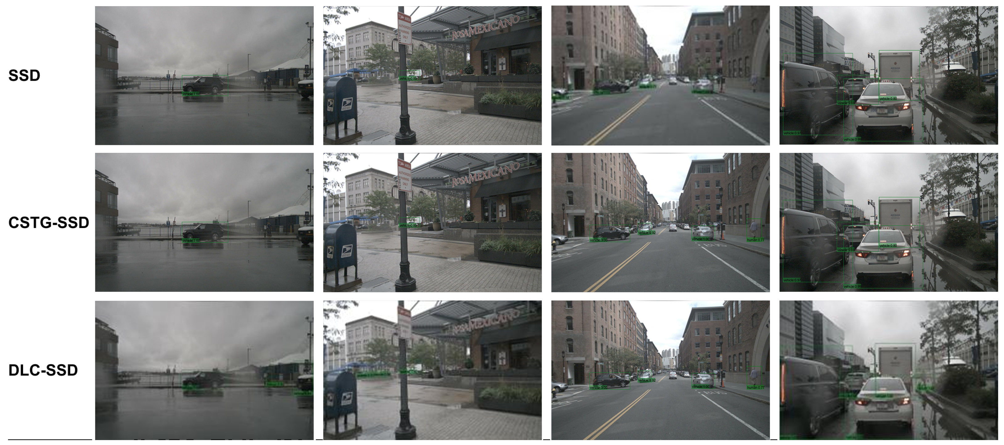 At the same time, qualitative failure analysis reveals several boundaries of the current design. DLC-SSD still struggles when raindrops or water streaks cause severe local occlusions, when distant objects occupy only a few pixels and are easily confused with background noise, and when strong reflections on wet roads or glass surfaces distort object contours. In addition, scenes with extreme contrast between bright light sources and dark surroundings can induce unstable filter responses and attention weights, leading to missed detections or false positives around headlights and specular highlights. These patterns are broadly consistent with known limitations of 2D, appearance-based single-frame detectors, and indicate that even with more advanced image-space operations, such as content-aware contrast enhancement or reflection and artifact suppression, the visual evidence in single RGB frames often remains intrinsically ambiguous under such complex degradations. This suggests that degradation-aware image normalization should be complemented by temporal or multimodal cues, such as depth, LiDAR, and radar, rather than relying on image-space processing alone to fully resolve these challenging cases.