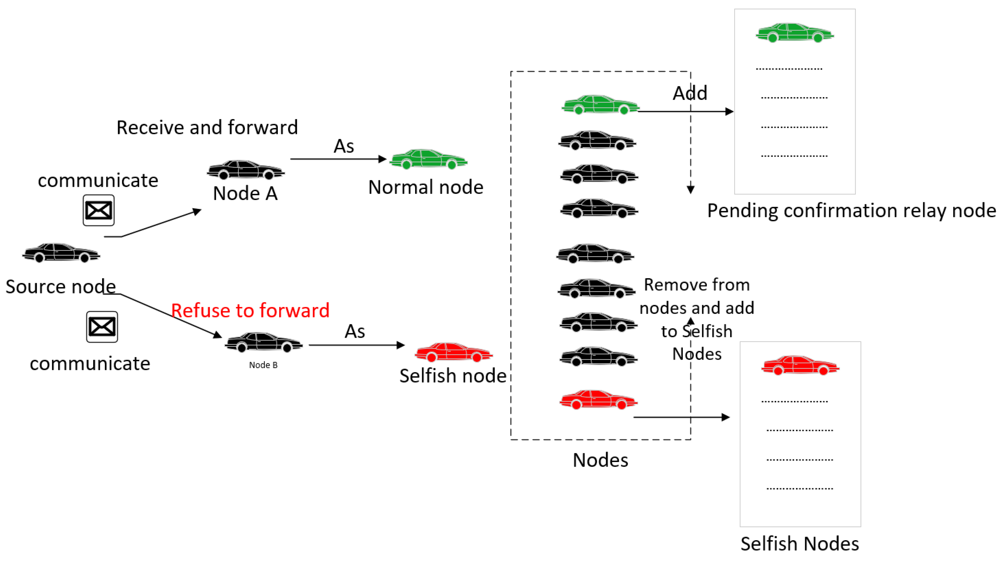 In early studies, mechanisms such as monetary incentives and watchdogs were commonly used to monitor node forwarding behavior [13]. These approaches were later introduced into VANET scenarios for detecting selfish nodes. In [14], a watchdog system is employed to identify selfish nodes in the network, where watchdog nodes analyze messages received through social relationships between nodes to determine selfish behavior. Sanaz Nobahary et al. proposed a credit-based selfish node detection scheme in [15], where credits are stored at nodes and cluster heads are used to identify selfish nodes. Such methods are structurally simple and incur low detection costs; however, they are prone to the effects of unstable links and tend to perform poorly in sparse network scenarios.