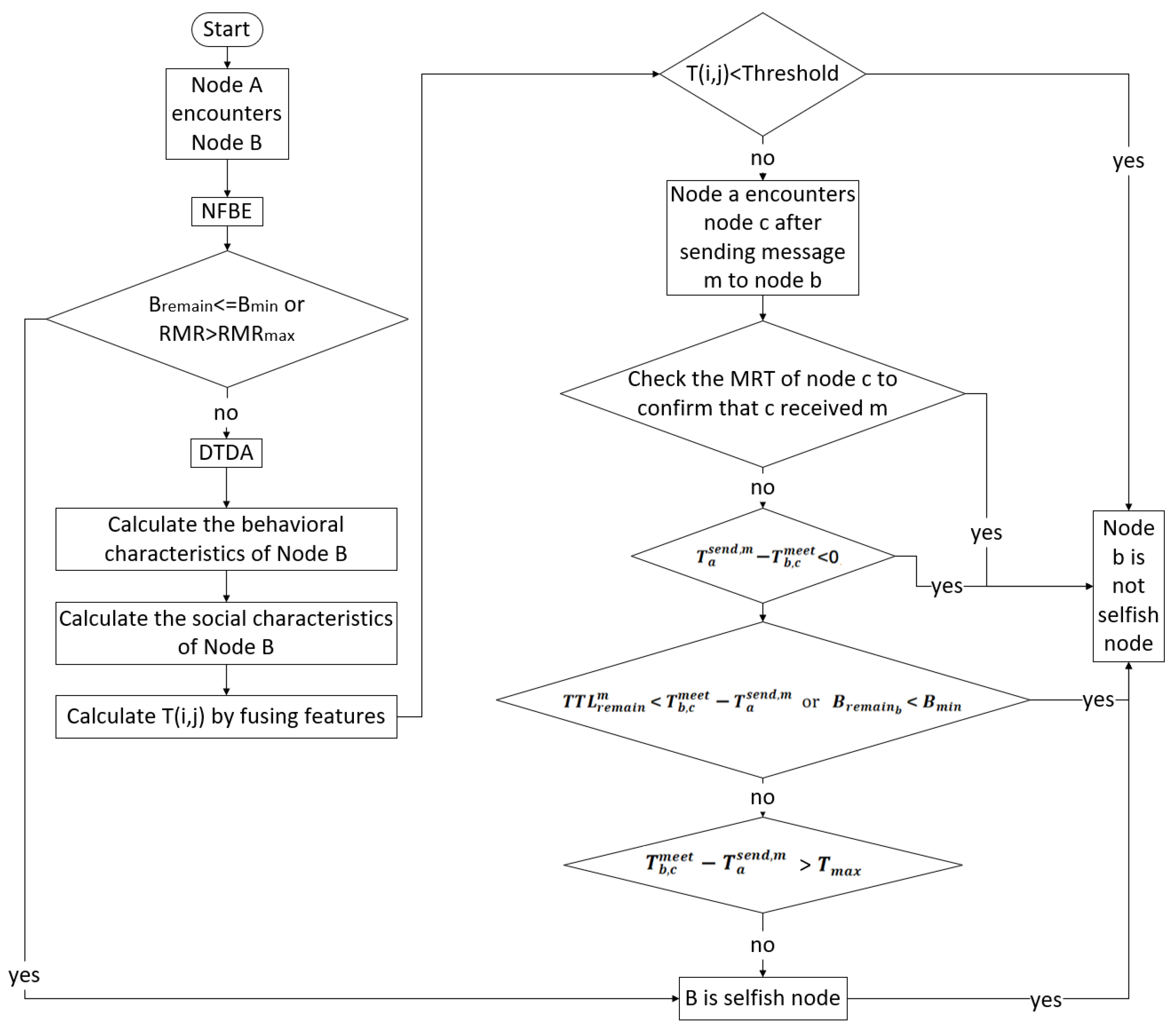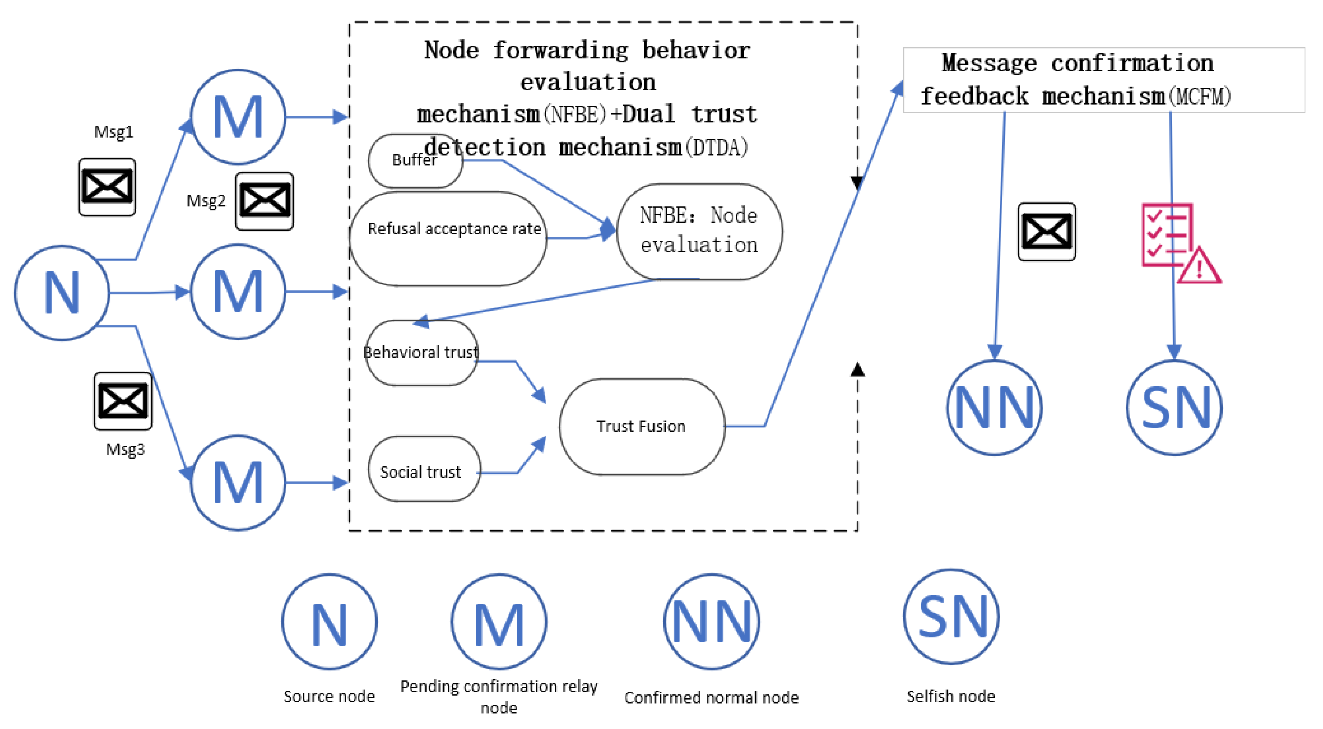 • If R M R R M R max , the node may refuse messages occasionally for certain reasons, but this alone does not prove that it is selfish. In this case, the NFBE mechanism cannot conclusively determine the node’s selfishness, and the node will be further evaluated using the Dual-Trust Detection Algorithm (DTDA) for a more in-depth assessment.