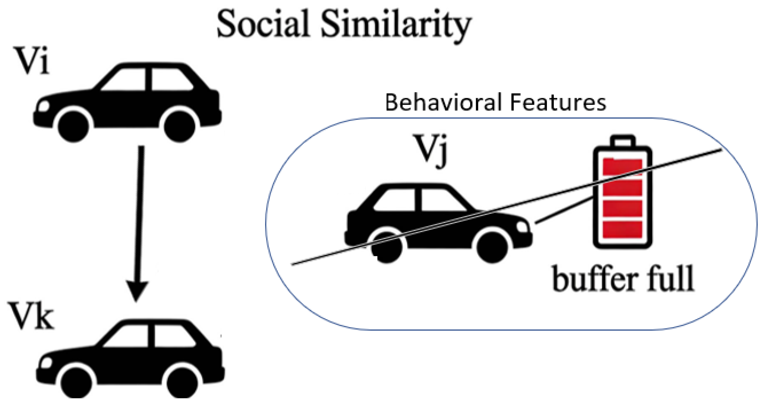 In VANETs, vehicular nodes are not merely independent entities but also exhibit social characteristics. Some vehicles repeatedly encounter each other along the same road segments, and certain pairs of vehicles have higher contact frequency, shorter geographic distance, or extensive historical interactions. These social interactions often indicate potential stable trust relationships: while behavior trust can only capture short-term interaction performance, social features reflect long-term associations and interaction stability between nodes, enabling a more comprehensive trust evaluation framework. In this study, social features are modeled from three perspectives: contact frequency, social similarity, and distance decay.