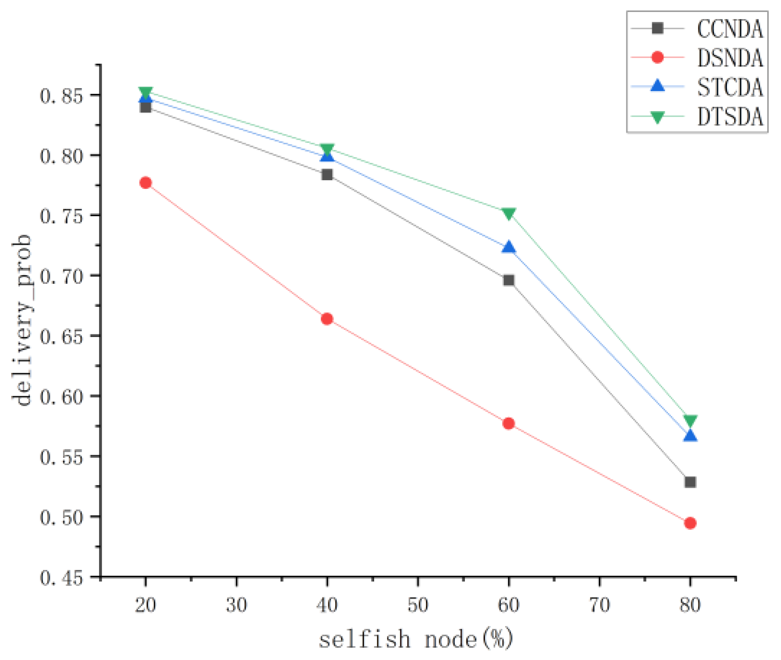 Figure 9. Comparison of message delivery rates for different schemes under different selfish node percentages.