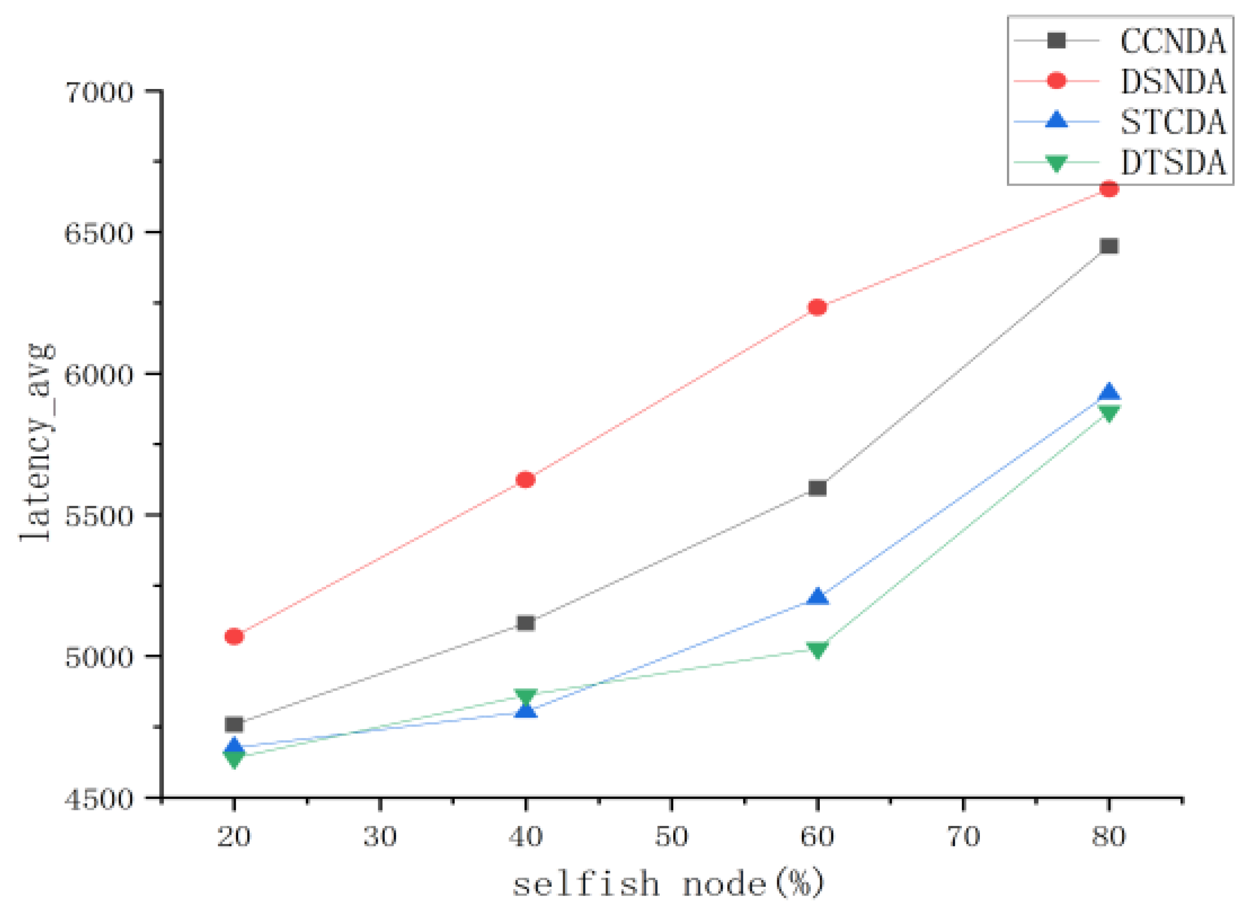 Figure 10. Delay of various schemes under different selfish node percentages.