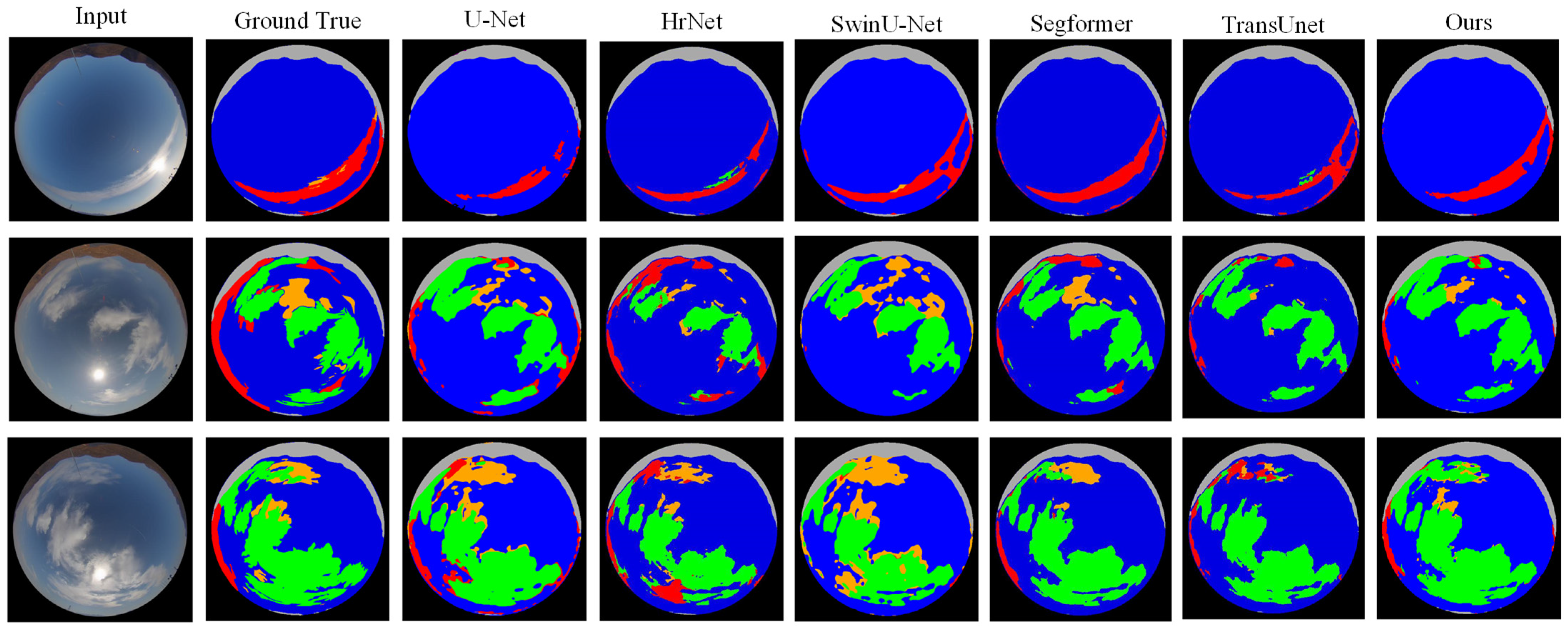 - Liu, S.; Zhang, J.; Zhang, Z. TransCloudSeg: Ground-based cloud image segmentation with transformer. IEEE J. Sel. Top. Appl. Earth Obs. Remote Sens. 2022, 15, 6121–6132. [Google Scholar] [CrossRef]