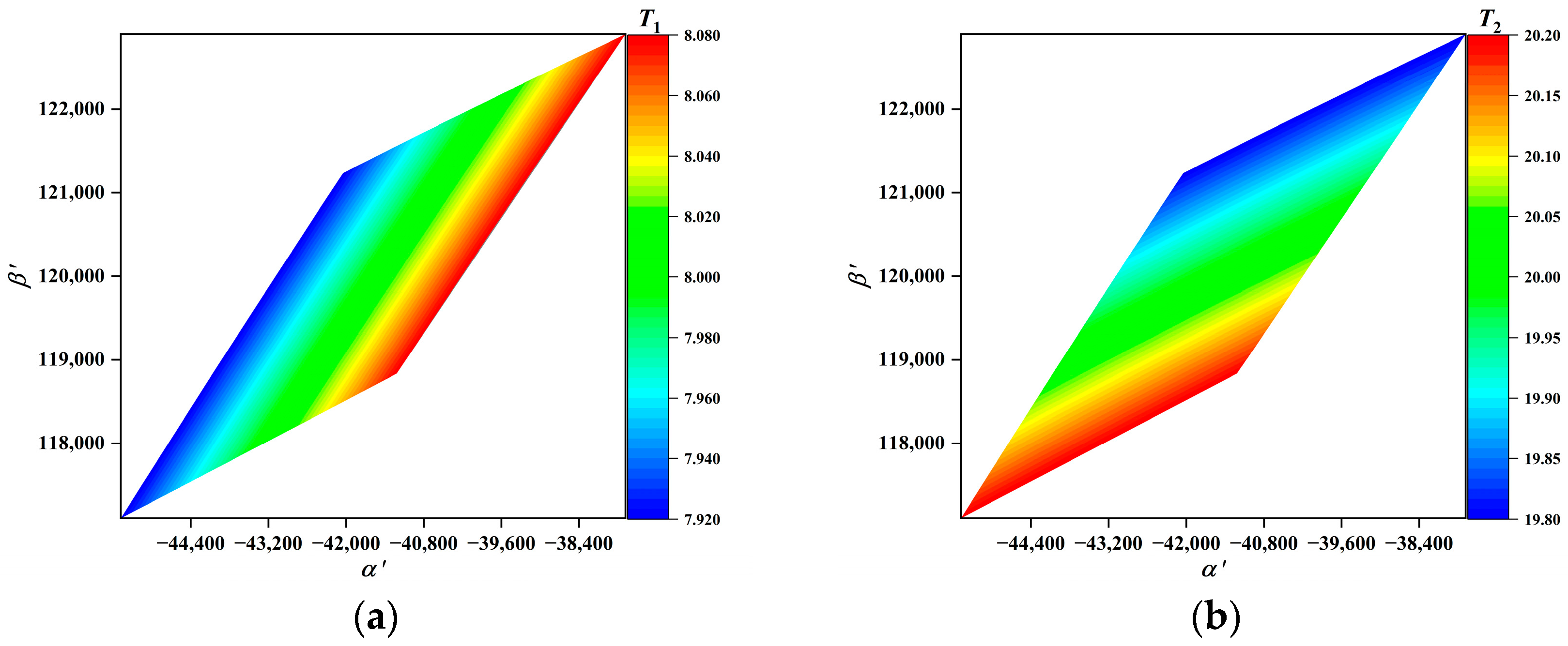 | 3: For four combinations of T1 ± 1% and T2 ± 1%: 4: Solve α′_vertex, β′_vertex = fsolve(root2d, x0) 5: Store vertices in vertex_set |