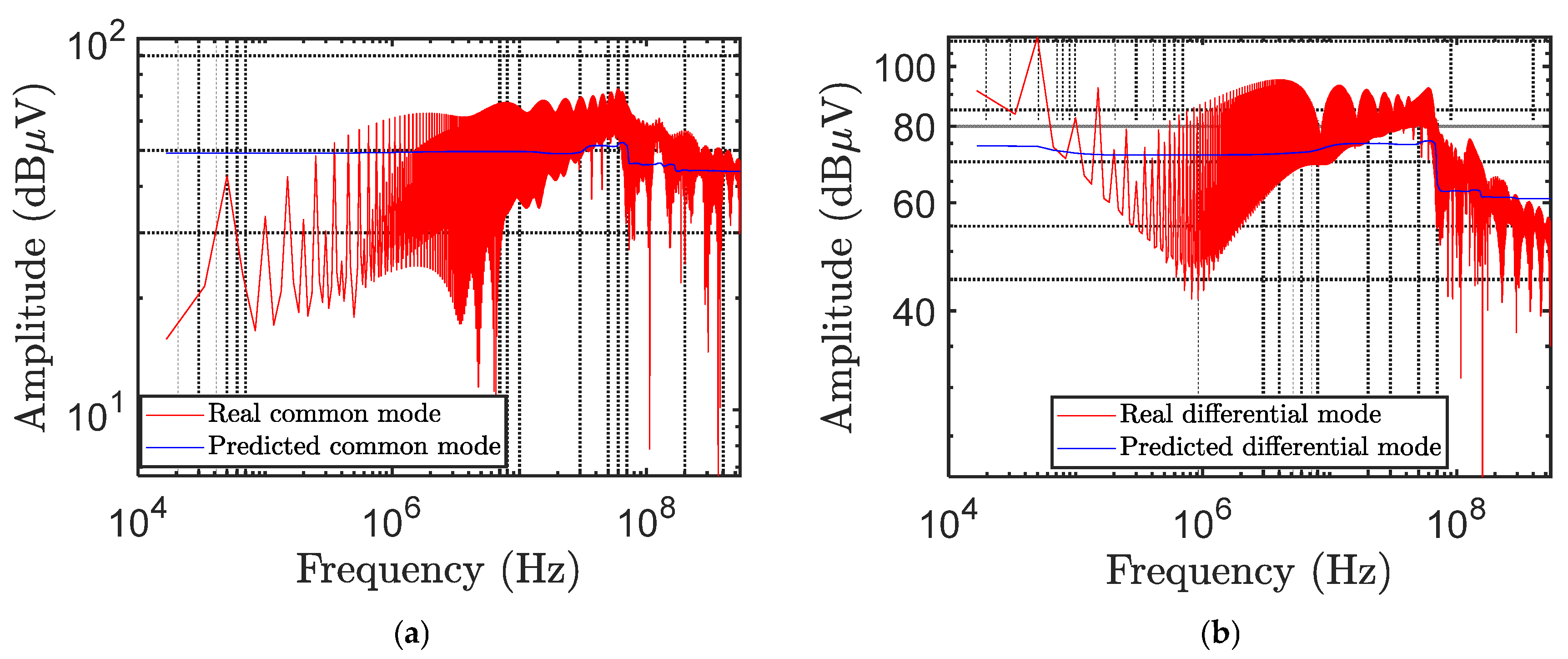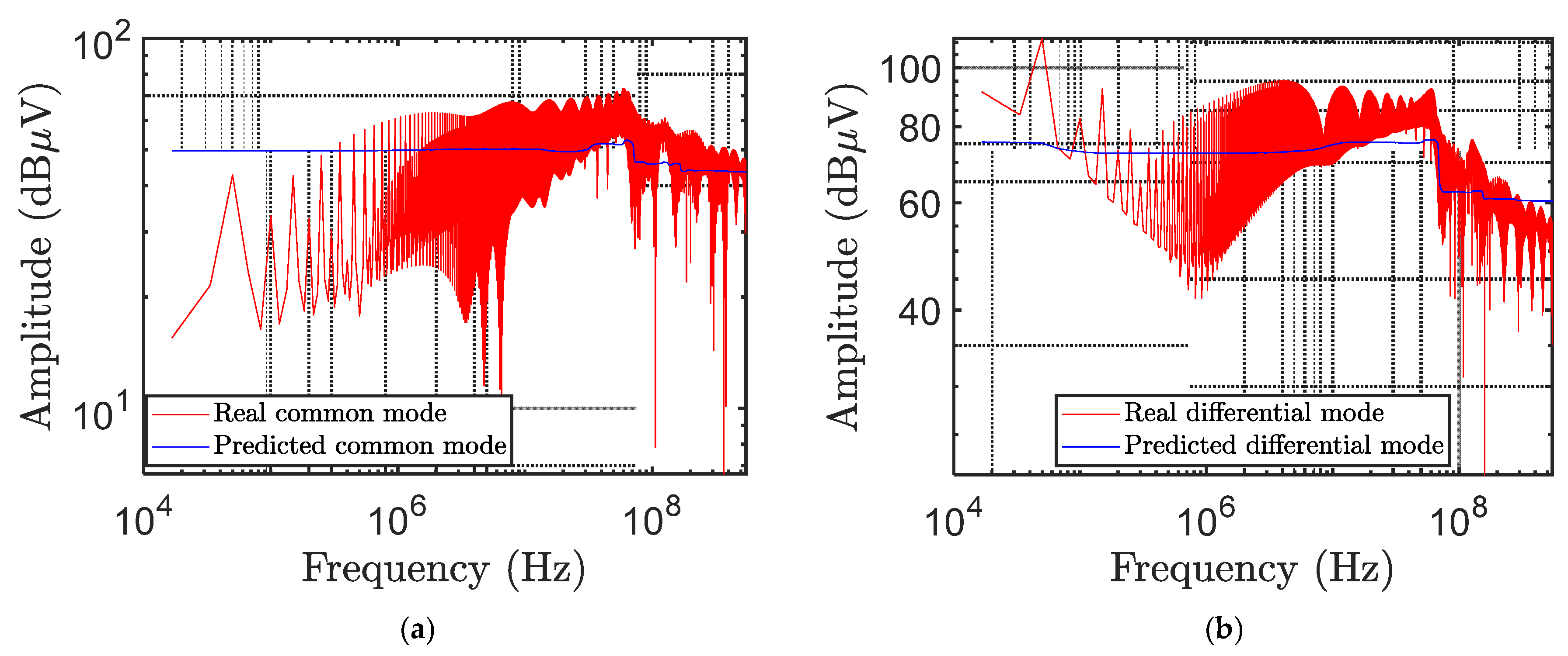 Following the completion of each prediction, the frequency values are denormalized to determine the true frequency in Hz, and the linear units are converted to decibel microvolts (dBµV). For clarity, the script then uses logarithmic scales (also known as the semilogx plot function) to plot the predicted CM and DM amplitudes as a function of frequency across multiple orders of magnitude. Furthermore, experimental reference data with measured CM and DM levels across frequencies is imported from a text file called real_Vmc_Vmd.txt. Thus, it makes it possible to compare predicted and actual values graphically in two different figures: one for the common mode and one for the differential mode.