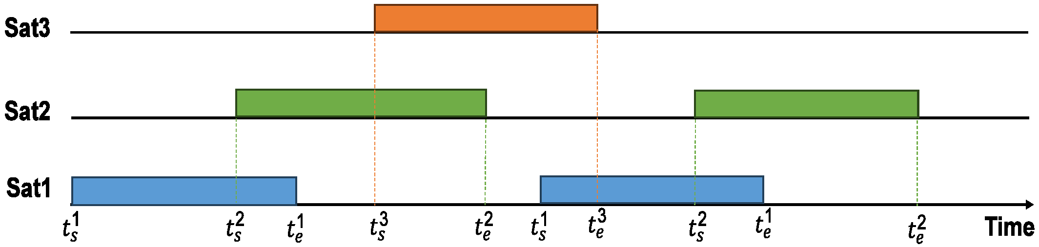 - Hu, X.; Song, Y.; Liu, S.; Li, X.; Wang, W.; Wamg, C. Real-time prediction and update method of LEO inter-satellite switching based on time evolution graph. J. Commun. 2018, 39, 43–51. [Google Scholar]