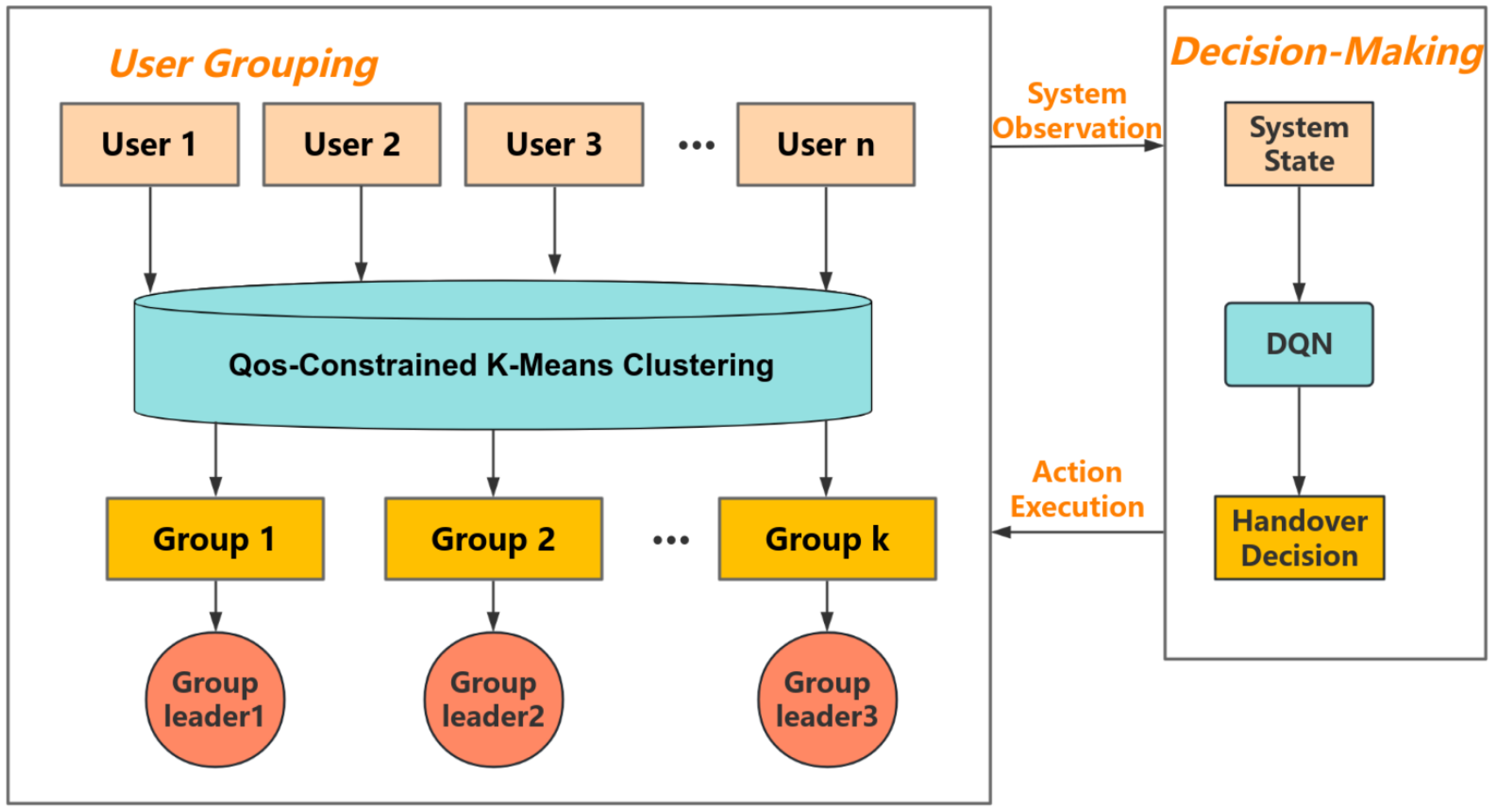 - Establishing a Hierarchical DQN-based group handover decision framework tailored to power IoT access: To address the state space explosion in scenarios with a large number of power IoT terminals transmitting periodic telemetry data and occasional emergency signaling, this paper designs a hierarchical decision architecture combining user clustering with DQN. At the start of each DQN round, user clustering is performed to select a cluster leader for each group. Subsequently, the cluster leader represents the entire group for DQN training and decision-making. This approach significantly reduces computational complexity and signaling overhead, enhancing the algorithm’s computational efficiency and scalability when supporting long-term and large-scale power system communications over LEO satellite networks.