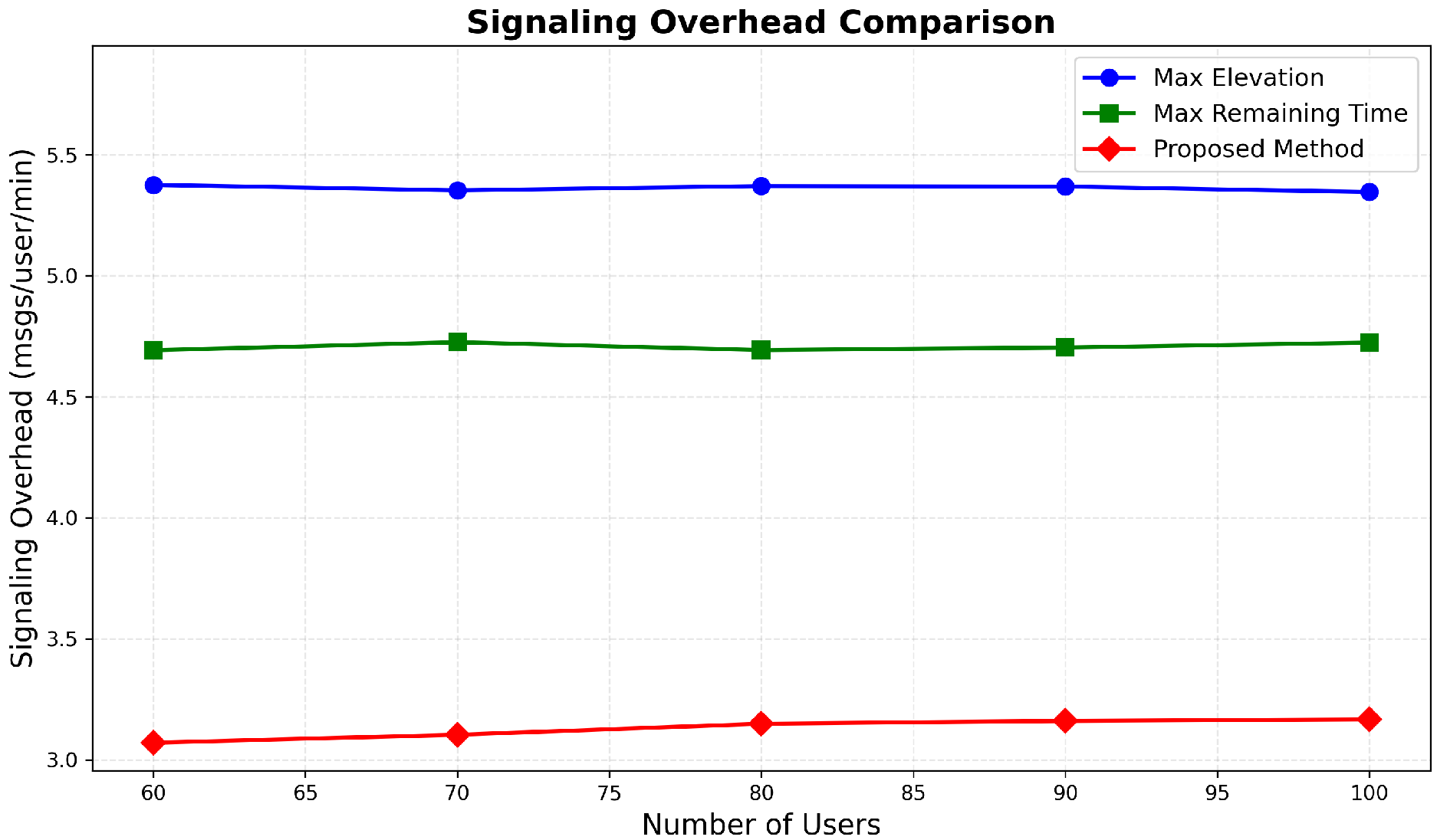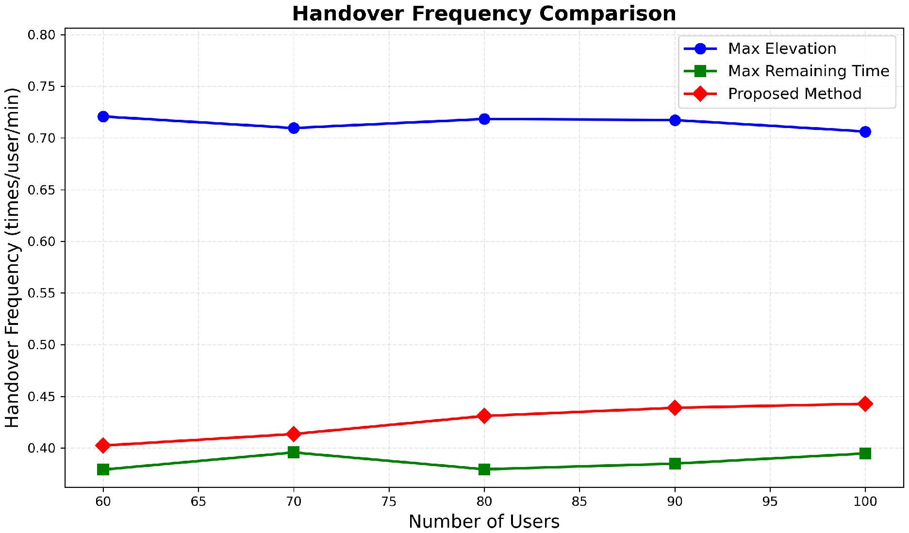 - Xing, S.; Zhao, K.; Li, W.; Ye, Y.; Fang, Y. Handover Algorithm Based on User Clustering and Graph Matching for Large-Scale LEO Satellite Network. In Proceedings of the 2025 10th International Conference on Computer and Communication System (ICCCS), Chengdu, China, 18–21 April 2025; pp. 791–796. [Google Scholar] [CrossRef]