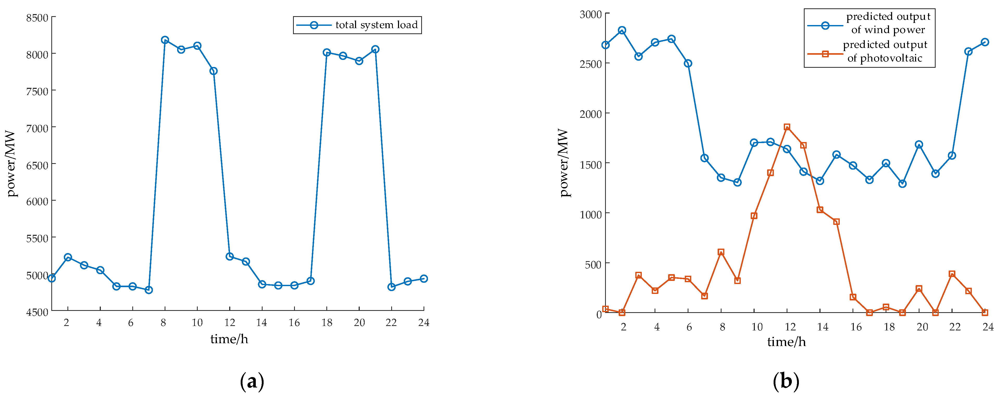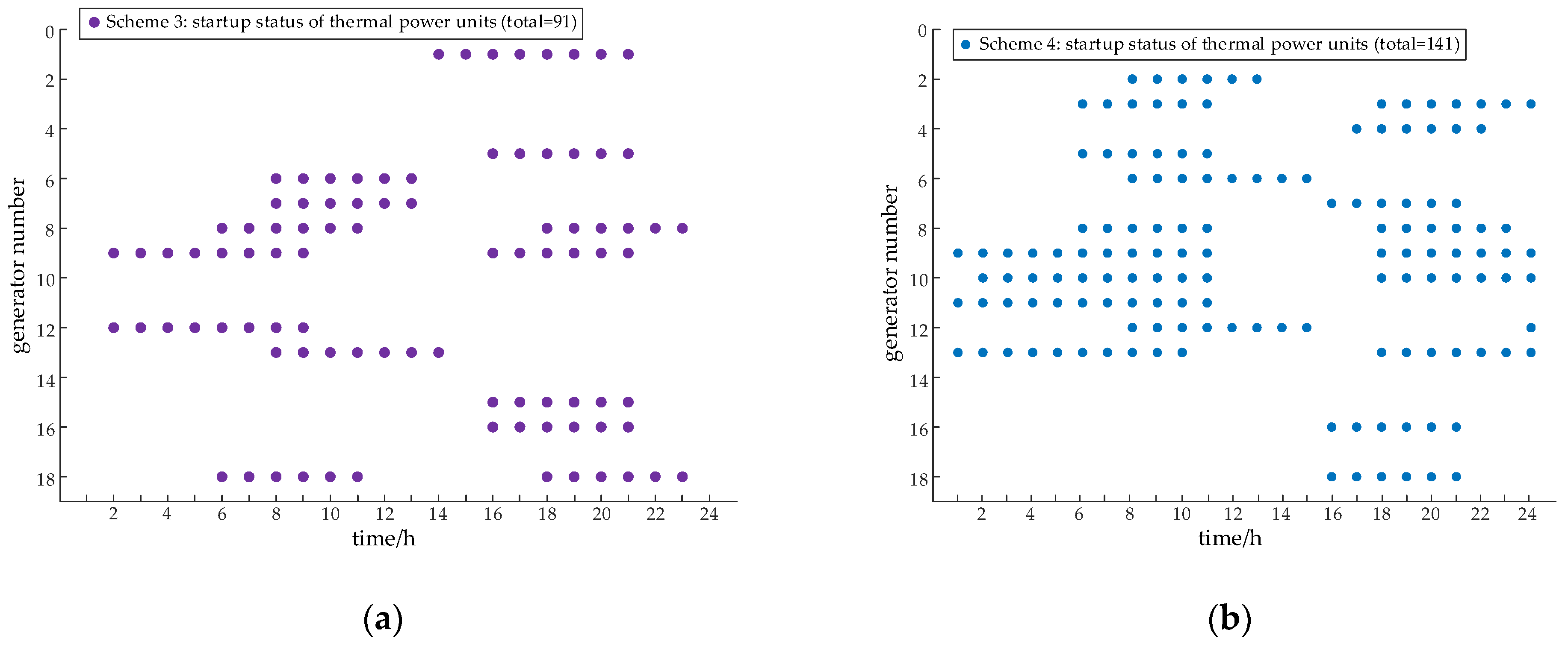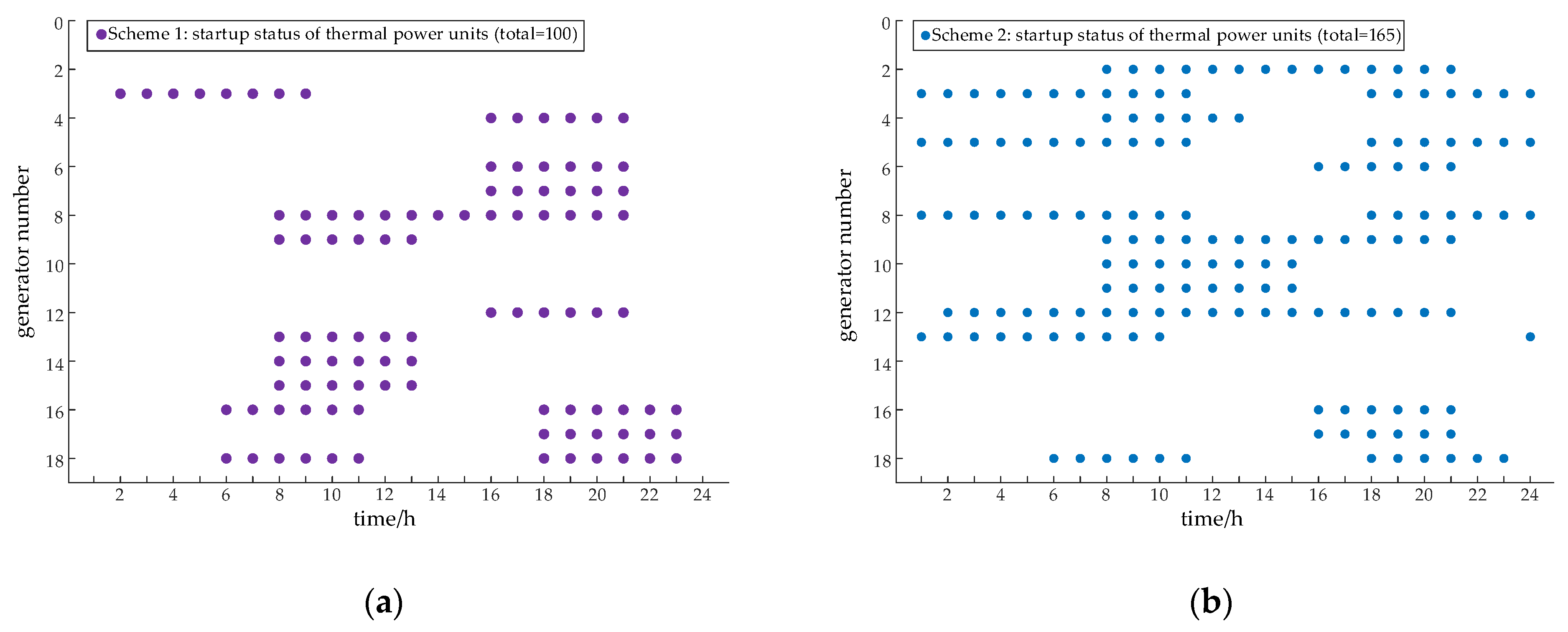 - Constraint on minimum start-stop time;where and represent the continuous operation and shutdown times of the i-th thermal power unit, respectively; and are, respectively, the minimum allowable continuous operation and shutdown times for the i-th thermal power unit.