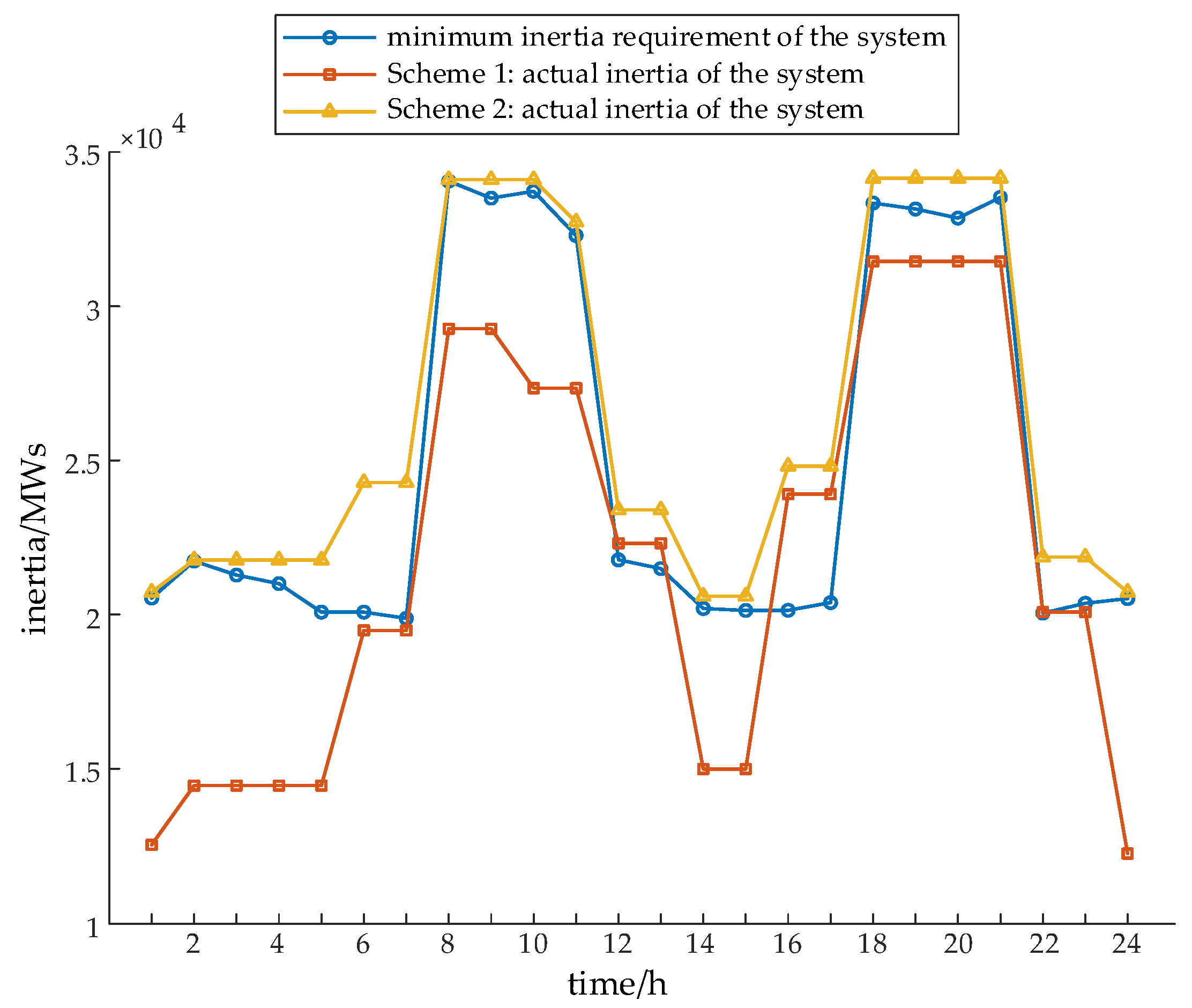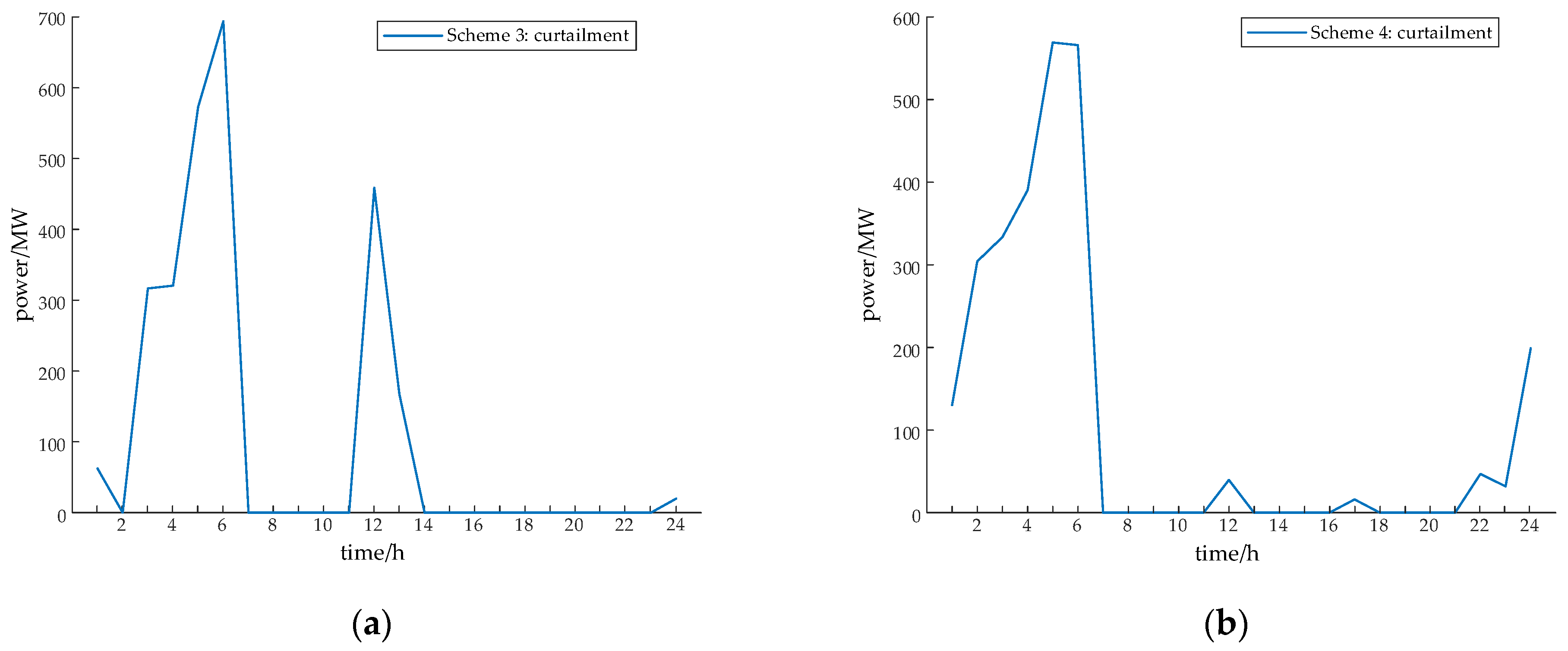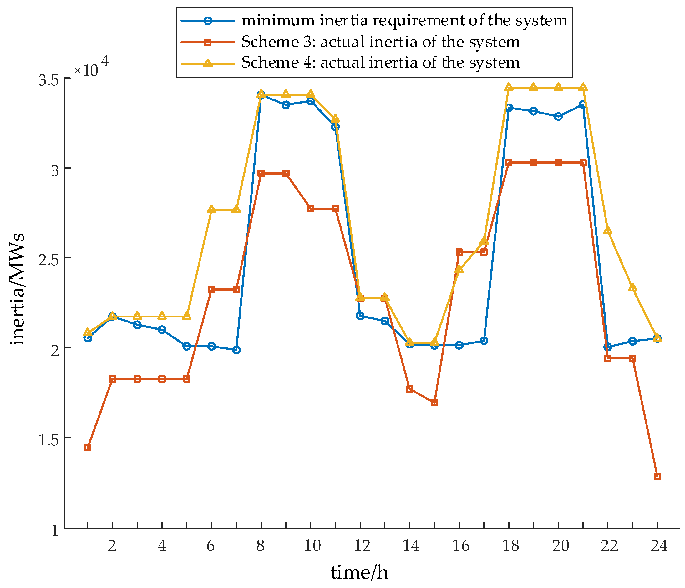 - The cost of wind and solar power curtailment in Scheme 2 is 2.15 million yuan higher than that in Scheme 1, and in Scheme 4, it is 300,000 yuan higher than that in Scheme 3. It can be seen that when considering the inertia constraint, the cost of wind and solar power curtailment has in-creased. This is because thermal power units usually have a minimum technical output. When the power grid selects to operate more thermal power units, due to the constant load at a certain moment in the power grid, some new energy sources that could have been consumed are abandoned. At the same time, pumped storage units may be more used for frequency regulation rather than consuming renewable energy, further exacerbating the curtailment of wind and solar power.