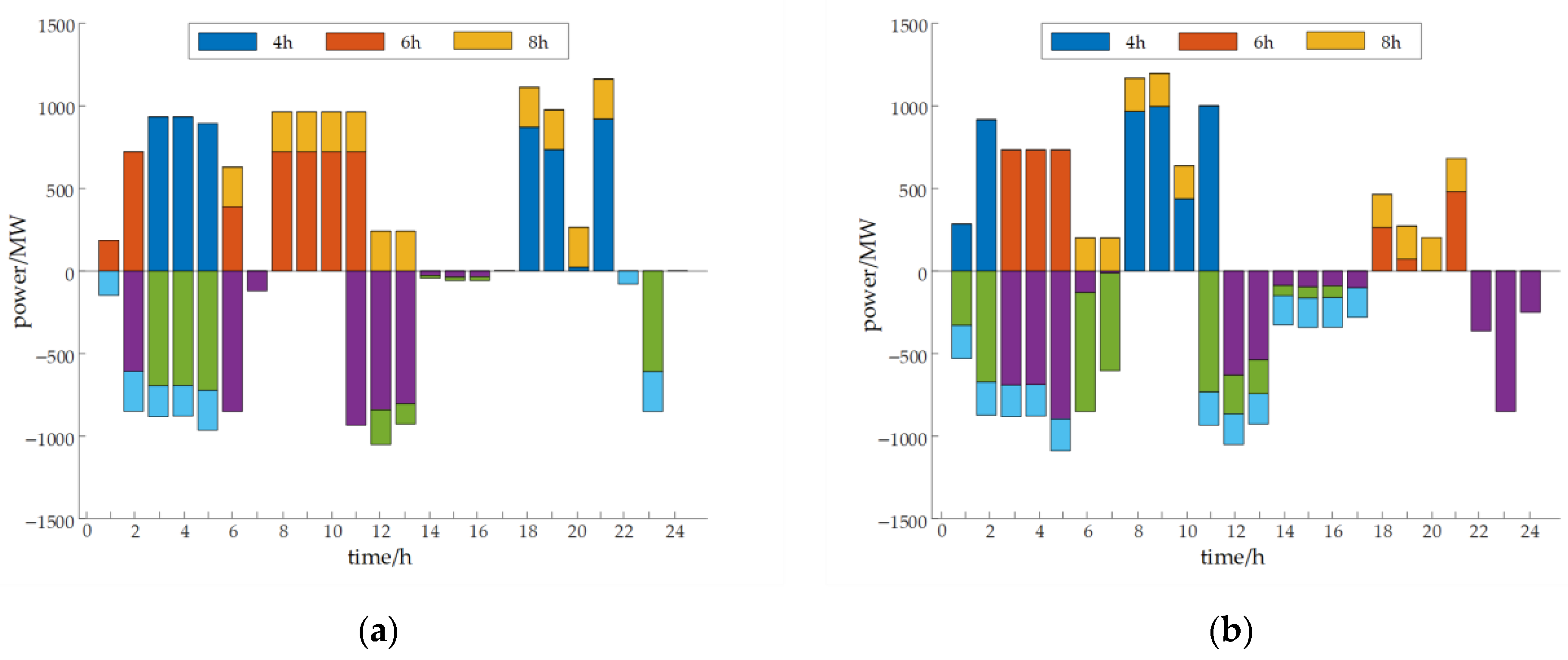 - In Scheme 3, the proportion of thermal power operation cost in the comprehensive system operation cost decreased by approximately 25% compared to Scheme 1. In Scheme 4, the pro-portion of thermal power operation cost in the comprehensive operation cost decreased by approximately 25% compared to Scheme 2. It can be seen that after considering the selection of pumped storage duration, the proportion of thermal power operation cost in the total long-term dispatching has decreased. The reason lies in that the hybrid units have a more obvious substitution effect on the functions of thermal power, the regulating value of pumped storage units has significantly increased, and the system’s dependence on thermal power units has decreased;