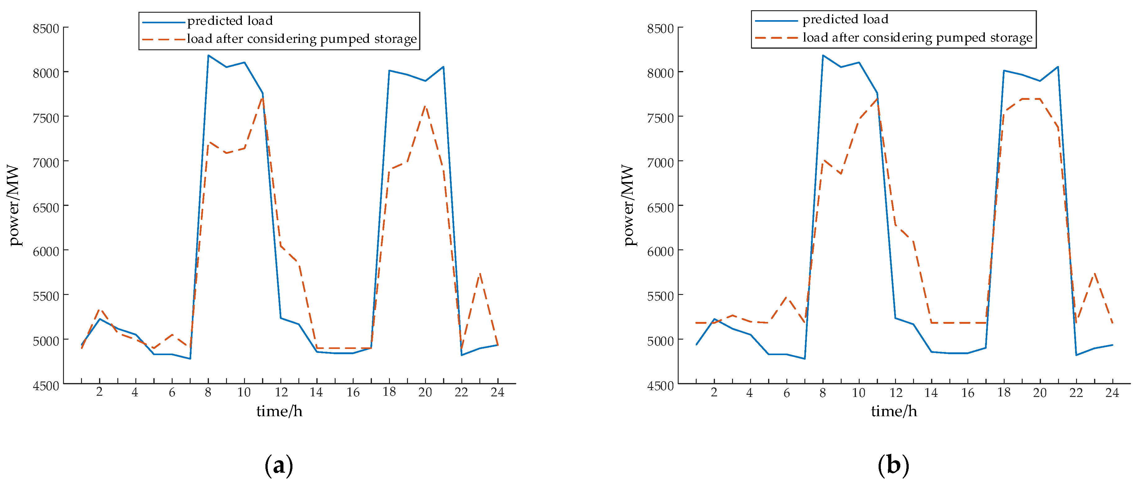 - Constraint on upper and lower limit of output power;where and represent the minimum and maximum power values of d-class pumped storage units under power generation conditions, respectively; and are, respectively, the minimum and maximum power values of d-class pumped storage units under pumping conditions; and are respectively the power generation and pumping power of d-class pumped storage units at time t.