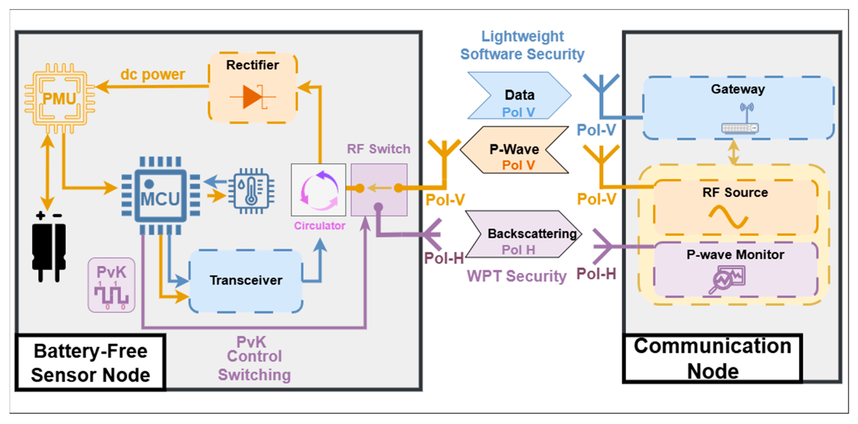 In a standard dual-wave SWIPT architecture, a P-wave is generated by the RF source at the Communication Node (CN) to wirelessly supply energy to the BFSN, while a separate wave is used for data communication through the BFSN’s transceiver. The proposed concept leverages the P-wave (normally used solely for energy harvesting) to introduce an additional security layer by enabling the BFSN to backscatter an identification signal even when its transceiver is turned off to conserve energy. This backscattered identification is controlled by a digital private key (PvK) generated by the BFSN’s low-power microcontroller, using minimal energy through simple General-Purpose Input/Output (GPIO) pin toggling. At the CN level, where no power constraints exist and a single CN can manage multiple BFSNs, a P-wave monitor is incorporated to detect and verify the backscattered identification signals. The key innovation contributed by this work lies in transmitting the backscattered wave (uplink from the BFSN to the P-wave monitor) with an orthogonal polarization relative to the incoming P-wave, thereby mitigating clutter and cross-jamming effects typically observed in real-world environments. As a result, an extra authentication layer is added without modifying the data communication protocol (see Figure 1), and with minimal additional power consumption.