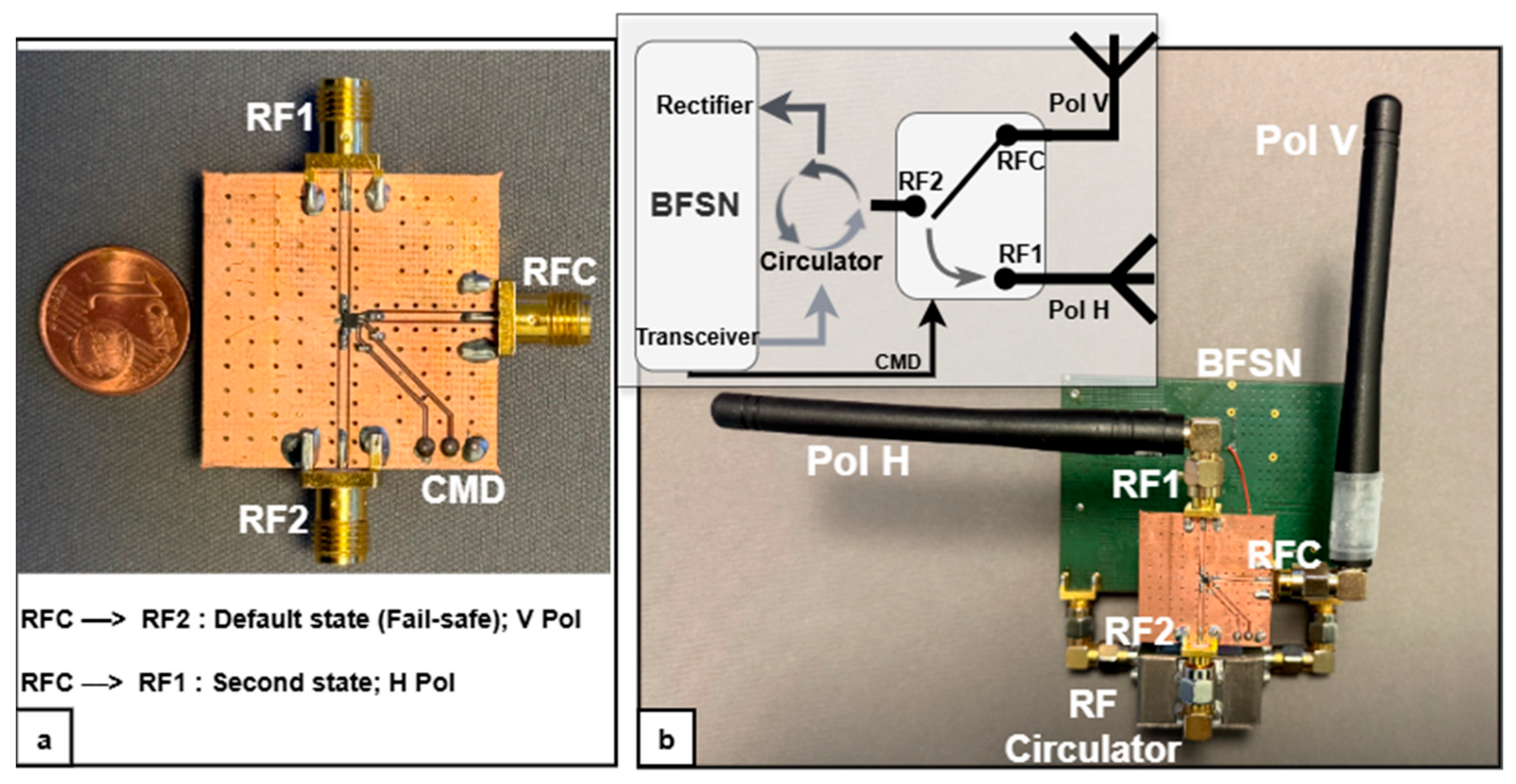 Figure 2. (a) Fail-safe SPDT RF switch assembled on an FR4 0.8 mm substrate with SMA connectors; (b) LoRaWAN-based BFSN integrating the RF switch, connected to two antennas arranged in a cross-polarized configuration; the inset illustrates the schematic of the proposed add-on polarization-shift backscatter module.