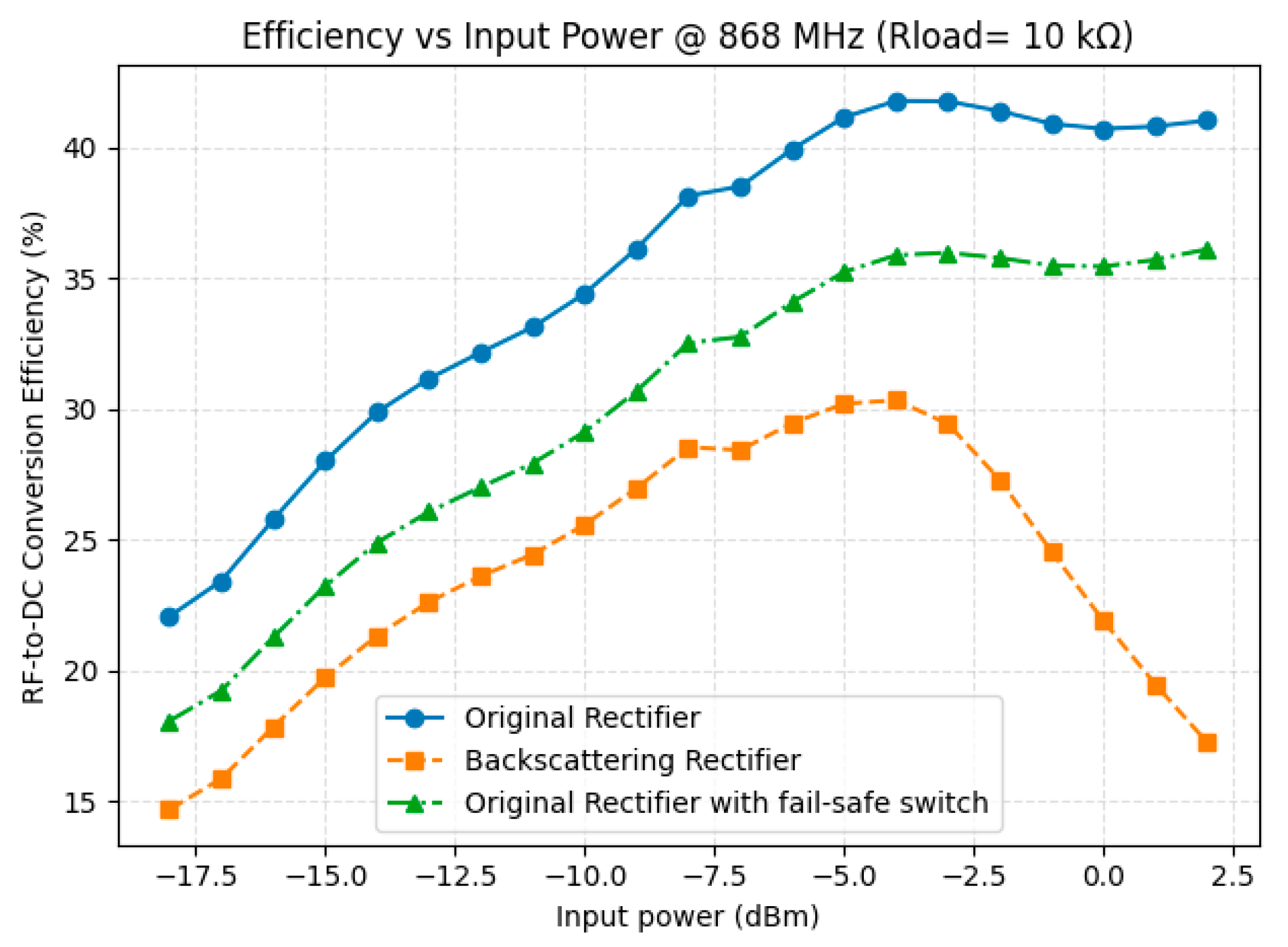 RF-to-DC efficiency measurements show that the proposed fail-safe RF switch add-on preserves the efficiency profile of the original BFSN rectifier and consistently outperforms the backscattering rectifier by 5–15% while introducing only minimal insertion loss.