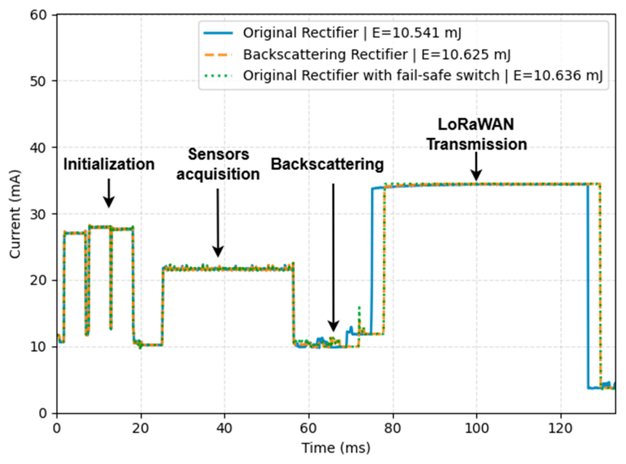 After validating the backscattering capability and evaluating the harvesting efficiency, the energy consumption impact of the proposed identification mechanism was analyzed. In normal operation, the BFSN executes a periodic cycle consisting of system initialization, sensor acquisition, and data transmission via its LoRaWAN radio transceiver. In the proposed security concept, an additional 3 ms backscattering sequence via GPIO toggling is inserted immediately before radio transmission to identify the node. Current consumption measurements were performed for three configurations: (i) the original BFSN, (ii) the BFSN using a backscattering rectifier for identification, and (iii) the BFSN equipped with the proposed fail-safe RF switch add-on module. The measured current consumption profiles of these tasks as a function of time are presented in Figure 6, enabling a direct comparison of the overhead introduced by each identification approach.