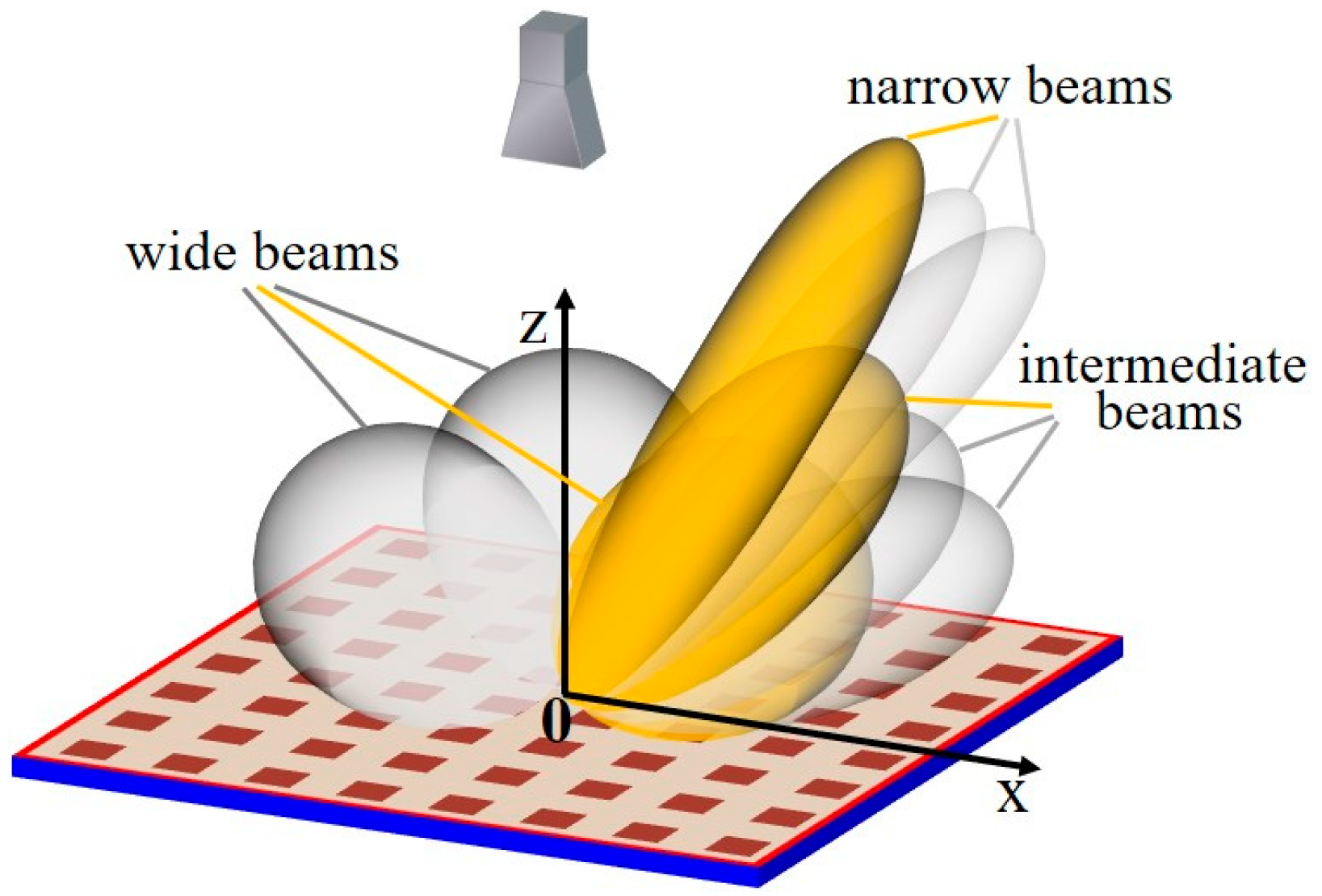 Phased electromagnetic (EM) surfaces offer a cost-effective route to versatile beamforming, making them prime candidates for next-generation radar and communication systems [1,2,3,4,5,6]. However, a critical knowledge gap concerning their achievable beamwidth limits their use in wide-beam applications like hierarchical target searching [7,8] and channel estimation [9,10,11]. The theoretical foundation for generating tiered beamwidths (as illustrated in Figure 1) remains unestablished, impeding both design guidance and system performance prediction.