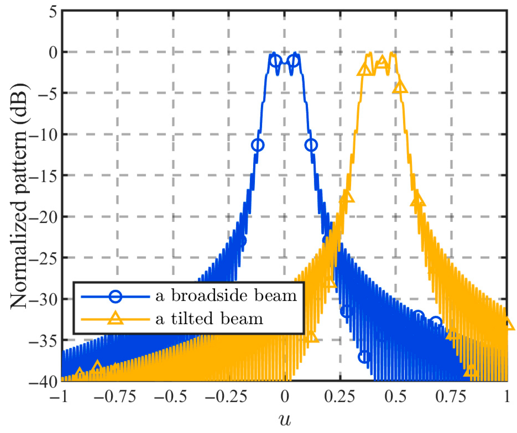 Finally, the analysis generalizes for beam steering. A similar derivation for the tilted phase profile in (2) shows that the resulting 1D patterns are simply translations of the broadside ones: