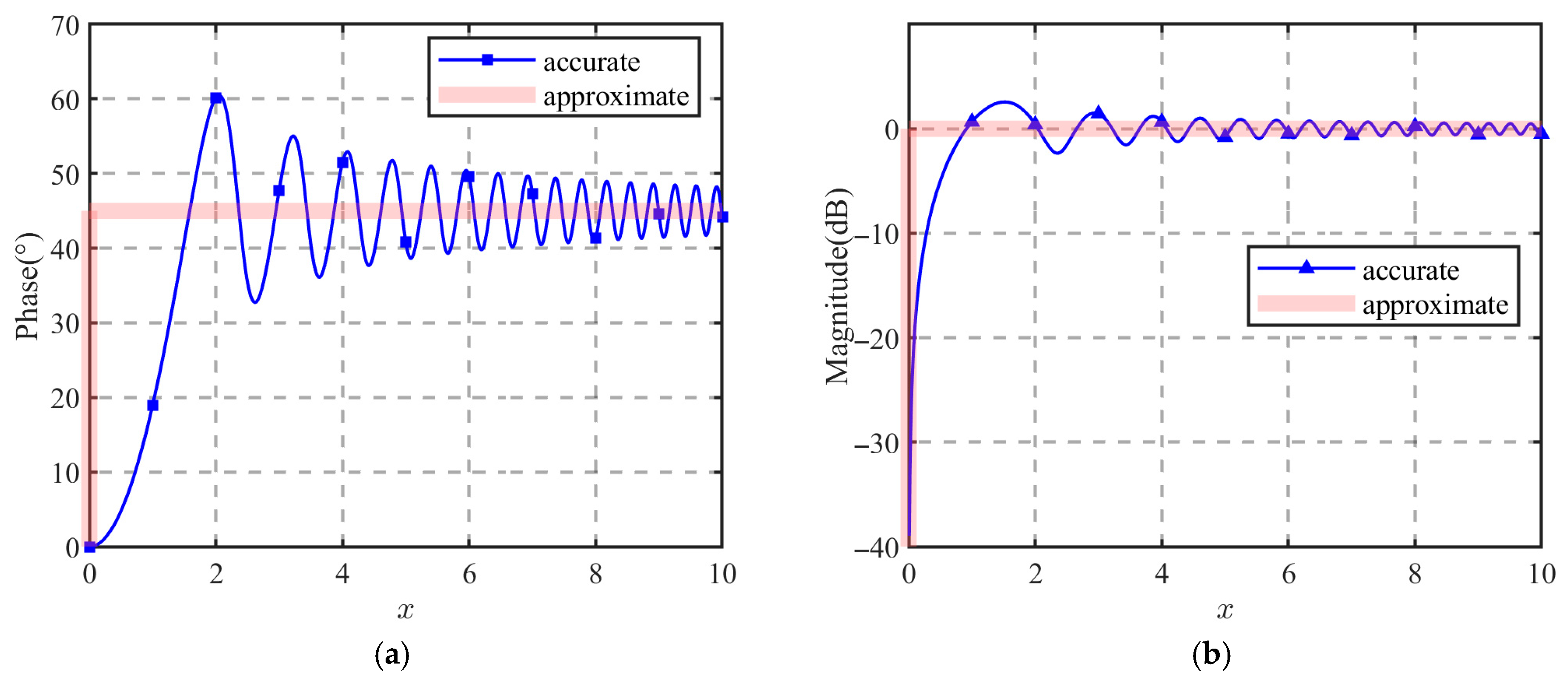 First, as plotted in Figure 4, the F r x phase (Figure 4a) varies mildly for large positive x. This allows approximating the pattern magnitude by directly considering the Fresnel term magnitudes. Specifically, for u a L / 2 π , both A and B are non-negative, and the terms add constructively. For u > a L / 2 π , one argument becomes negative, causing the terms to subtract due to the odd symmetry of the Fresnel integral F r x = F r x . Mathematically,