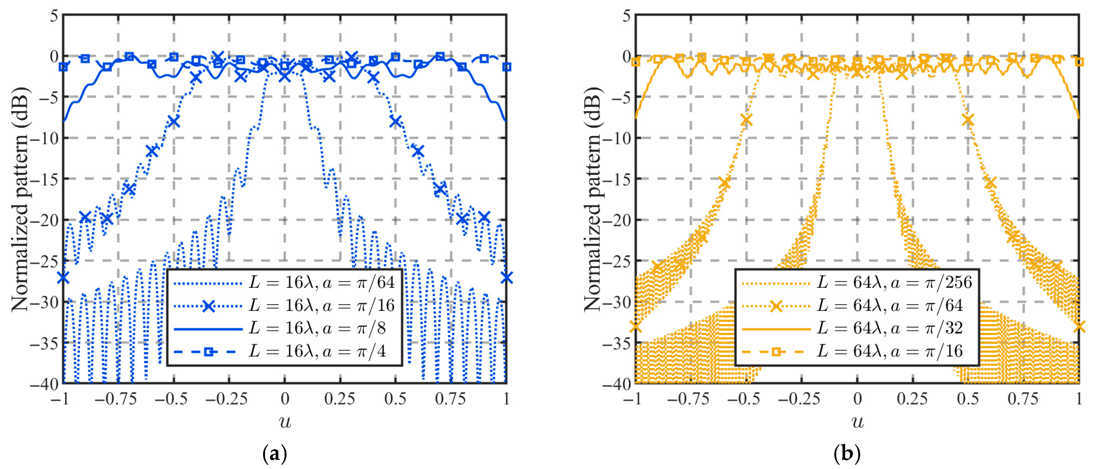 To validate the analysis, the Array Method is employed here and in subsequent sections, with its configuration details listed in Table 1. This approach isolates the specific variables under investigation by excluding external interference such as mutual coupling or structural scattering. The theoretical predictions from Equations (8) and (9) are clearly demonstrated by the normalized radiation patterns in Figure 5. In both Figure 5a for   L = 16 λ and Figure 5b for L = 64 λ , the beamwidth systematically expands as a increases. Moreover, a comparison across the two sub-figures shows that patterns sharing an identical a L product (e.g., L = 16 λ , a = π / 16 and L = 64 λ , a = π / 64 , where a L = π ) exhibit nearly the same beamwidth, further validating the scaling equation in (9). As depicted, this beam expansion culminates in quasi-omnidirectional coverage. At the threshold of a L = 2 π (the solid curves), the main lobe spans the entire visible half-space (approx. −6 dB at boundaries). Increasing a L beyond this point (e.g., to 4 π , plotted with square markers) flattens the patterns even further.