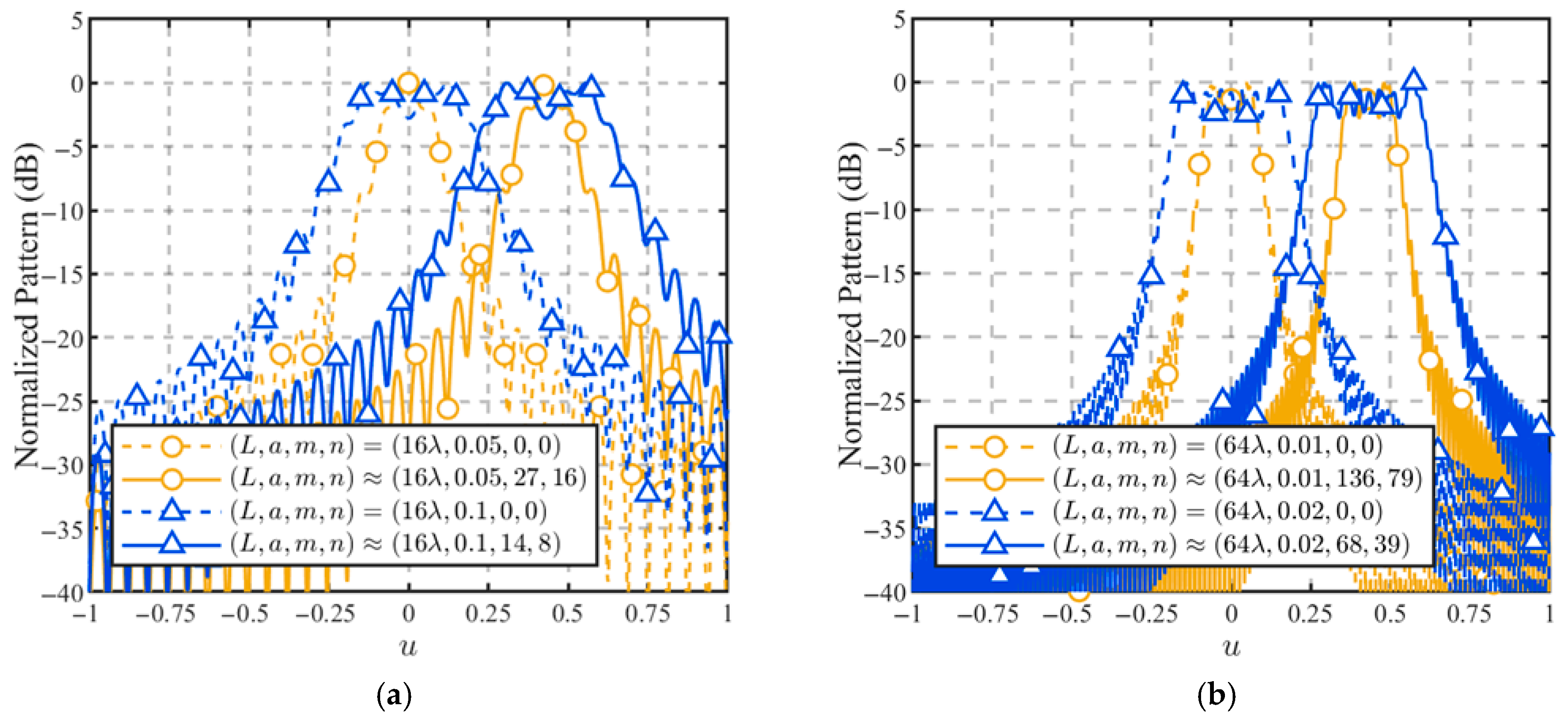 These equations demonstrate a versatile control mechanism where the beamwidth is primarily governed by a, while the beam direction is determined by the products am and an. The numerical results in Figure 6 provide clear validation. For both smaller ( L = 16 λ , Figure 6a) and larger ( L = 64 λ , Figure 6b) apertures, the patterns show that a beam of fixed width can be steered from broadside to a target direction (dashed vs. solid lines with identical markers). Furthermore, at a fixed target direction, beamwidth can be modified without affecting pointing accuracy (overlapping solid or dashed curves with circle and triangle markers). Such independent control over beamwidth and direction, afforded by the quadratic phasing scheme, holds true regardless of aperture size.