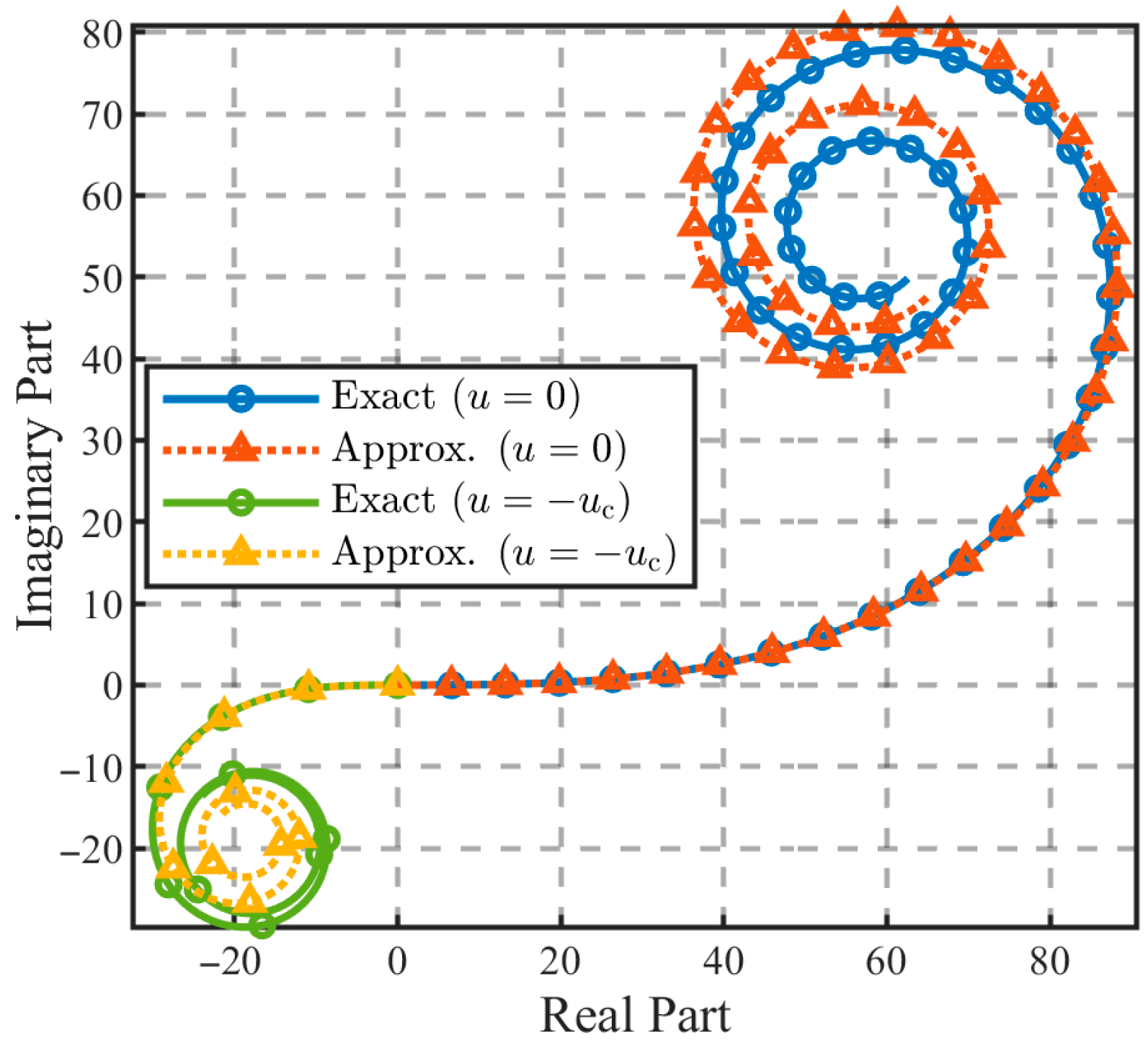 Figure 8. Integral trajectory buildup of the exact integral (21) and the approximation (22) for an L = 64λ aperture with a wide beam of BWc = 1 and aperture amplitude taper of +10 dB. The plot includes comparisons at the beam center (u = 0) and the critical boundary (u = −uc). The integration range expands outward from the stationary point x 0 , with trajectories shown up to 33λ for visual clarity.