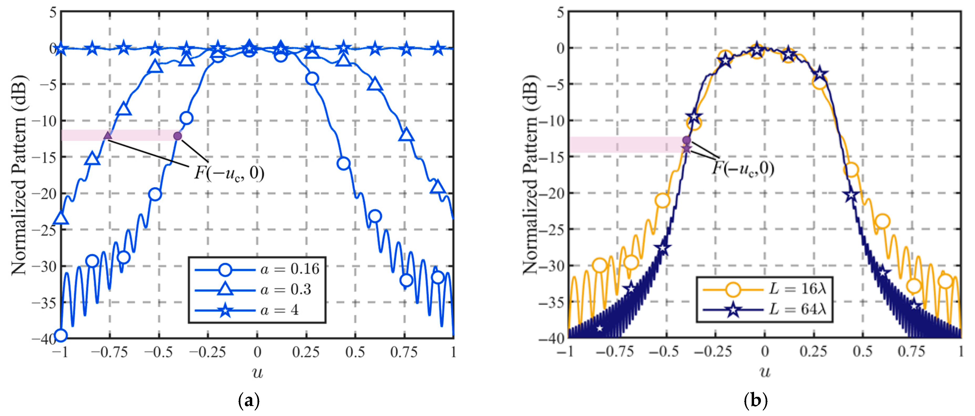 Figure 10. Validation of the independence of the main-lobe taper. (a) Effect of the quadratic phase coefficient a on the main-lobe characteristics for a fixed aperture size (L = 16λ) and amplitude taper (Tap ≈ 10 dB). (b) Effect of the aperture size L on the main-lobe shape for a fixed beamwidth (uc = 0.4) and amplitude taper (Tap ≈ 10 dB).