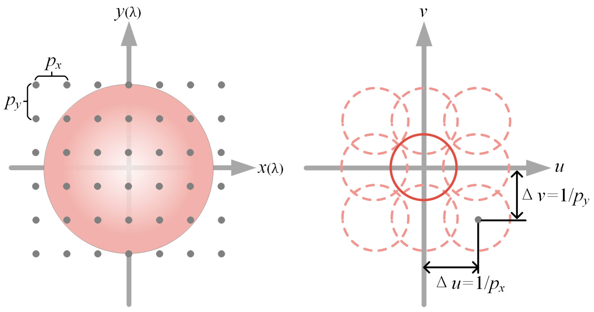 Figure 11. Illustration of the relationship between discrete aperture sampling in xy plane (left) and the resulting array factor in uv plane (right). The array factor consists of the continuous aperture’s far-field pattern periodically replicated into grating lobes, with spacing determined by the sampling periods (px, py). Magnitudes only are shown.
