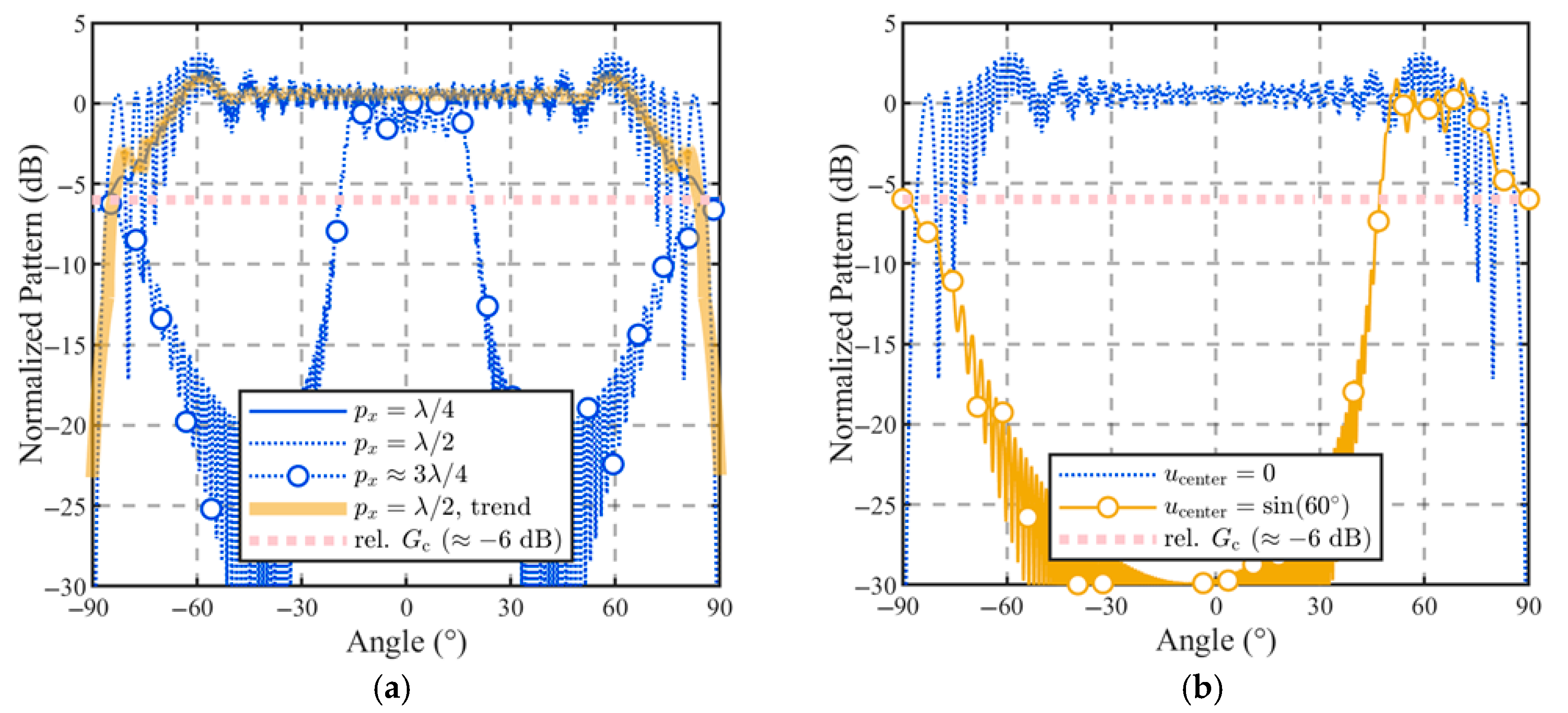 Figure 12. Numerical examples of Array Factor (AF) patterns of a 64λ∙64λ aperture with uniform amplitude, validating the maximum achievable beamwidths predicted in Table 4. Each pattern is normalized to its own beam center level. (a) Broadside beam, illustrating the effect of varying the element period px. (b) Fixed period (px = λ/2), showing the effect of scanning the beam to 60°.