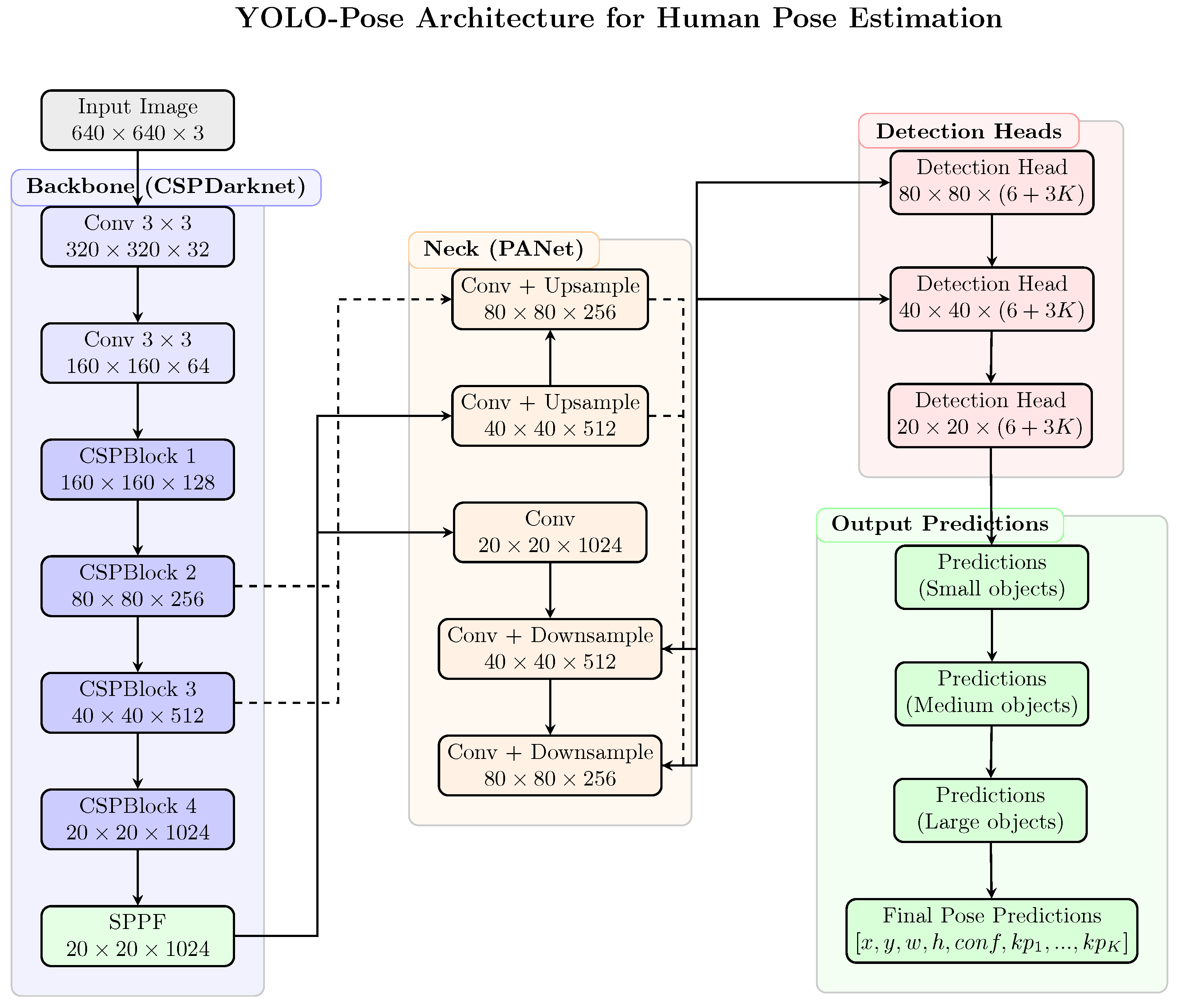 All experiments were conducted on an NVIDIA A100 GPU with 40 GB VRAM and an Intel Xeon CPU with 32 GB RAM. The YOLO-Pose component was trained with an initial learning rate of using a cosine decay scheduler over 1000 total epochs. The LSTM component utilized the AdamW optimizer with and a batch size of 64. Joint training employed mixed precision training (FP16) to accelerate convergence.