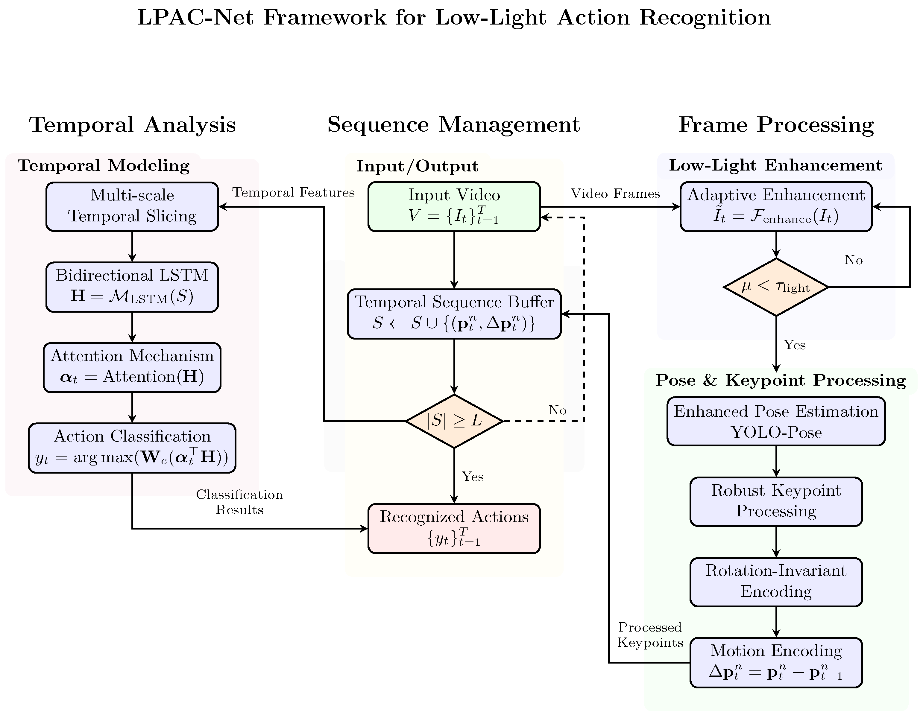 This paper proposes the Low-Light Pose-Action Collaborative Network (LPAC-Net), an end-to-end recognition framework specifically designed for monitoring scenarios in low-light industrial environments. The main innovations are as follows: