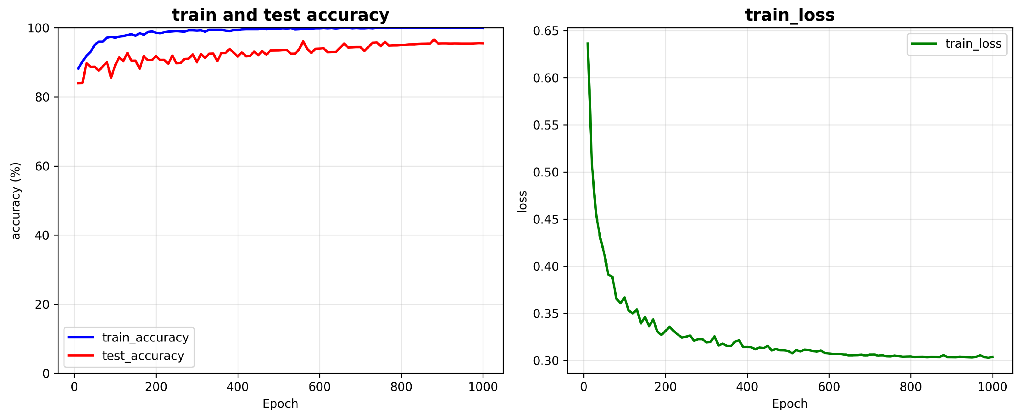 Figure 5 presents the comprehensive training dynamics of our LPAC-Net model over 1000 epochs. The accuracy curves demonstrate remarkable learning progress, with both training and test accuracy showing consistent improvement throughout the training process. The model achieves approximately 85% accuracy by epoch 200 and continues to refine its performance, reaching the final test accuracy of 95.53% at epoch 1000. The minimal gap between training and test accuracy curves (less than 2% after epoch 500) indicates excellent generalization capability with negligible overfitting.