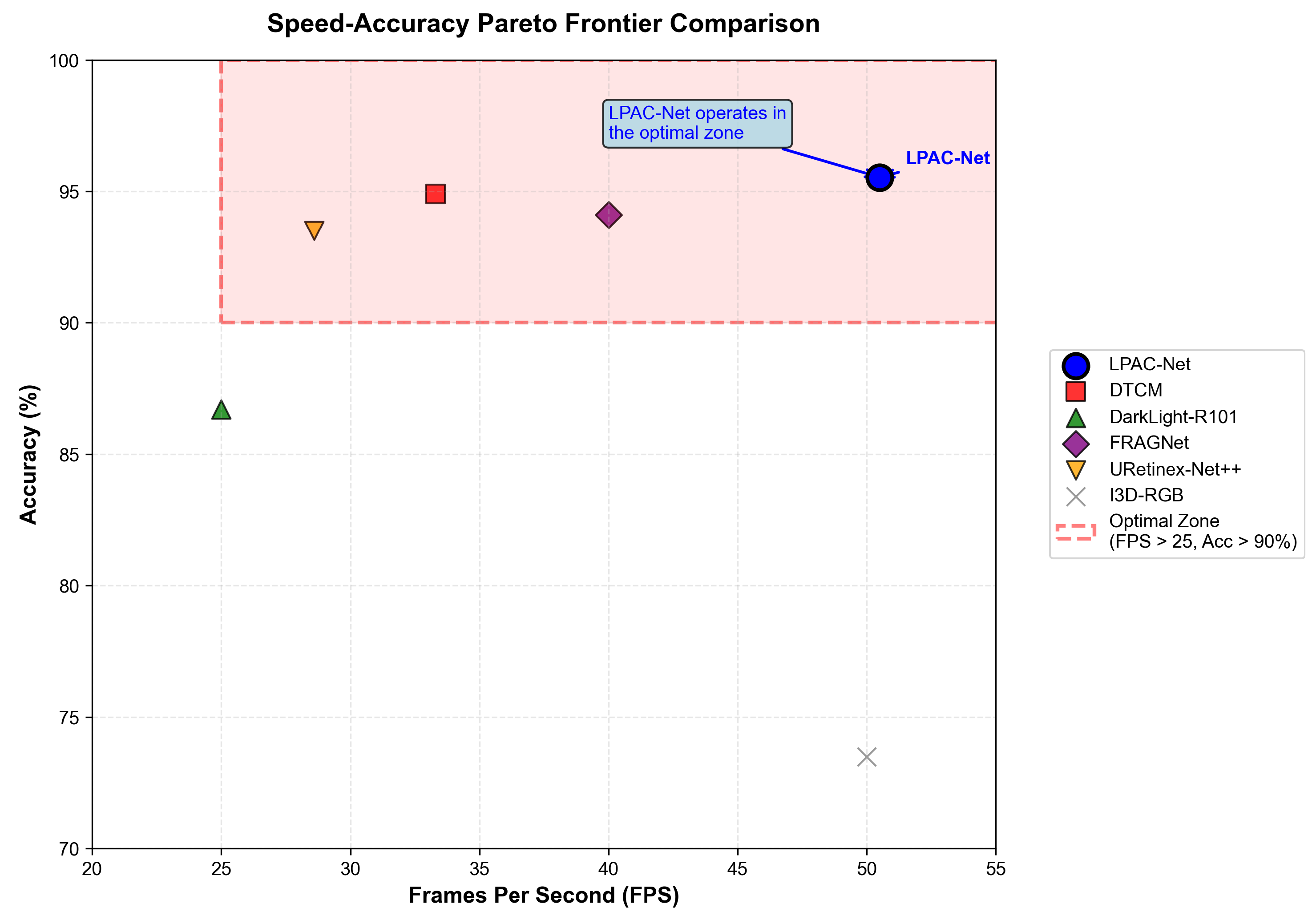 Figure 6 presents the speed–accuracy Pareto frontier comparison. LPAC-Net achieves the optimal trade-off, operating within the desirable region for industrial applications where both high accuracy (>90%) and real-time performance (>25 FPS) are required.