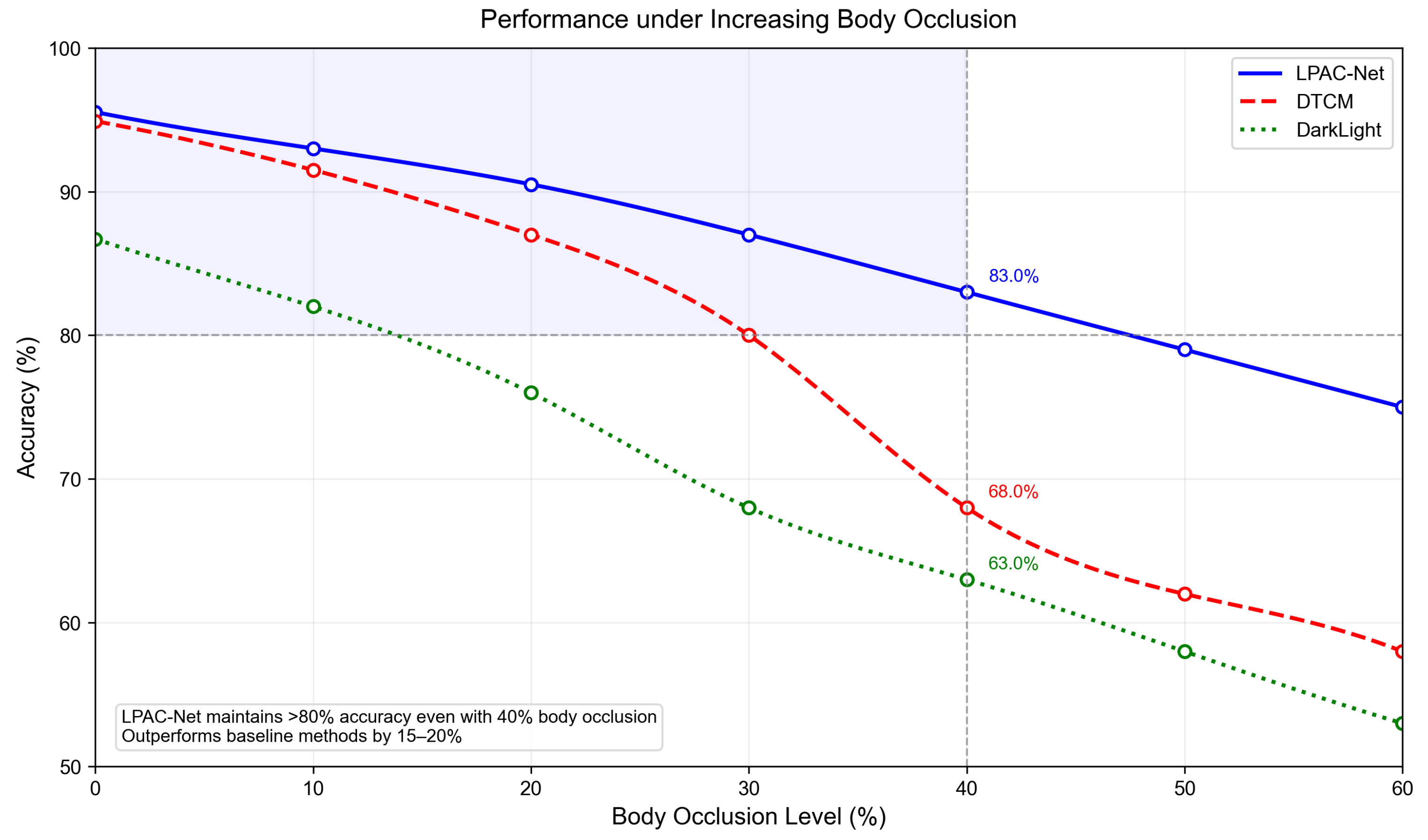 Figure 7 illustrates robustness to partial occlusion. LPAC-Net maintains over 80% accuracy even with 40% keypoint occlusion, significantly outperforming baseline methods which typically drop below 60% accuracy at similar occlusion levels. This performance is critical for industrial scenarios where equipment or tools may partially obscure workers.