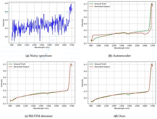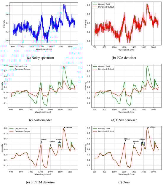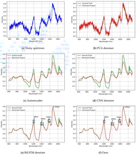 Visual comparison of reconstructed spectra under constant noise (σ = 0.5) using the Pharmaceutical Tablet dataset. Subplots show (a) noisy input spectrum; (b) PCA-based denoiser; (c) autoencoder; (d) CNN denoiser; (e) BiLSTM denoiser; and (f) our BiLSTM-FuseNet. Ground-truth spectra are plotted in green and denoised results in red. This figure provides a qualitative comparison of spectral reconstruction, while quantitative performance differences (including statistical significance) are reported in Table 3. The proposed model better preserves peak–valley structures and local absorption features (e.g., around 1206 nm, 1392 nm, and 1570 nm), while other methods tend to oversmooth or distort these regions.