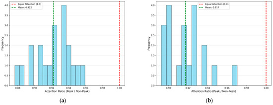 Peak-to-non-peak attention ratio distribution of BiLSTM-FuseNet. (a) Without peak weighting; (b) peak regions weighted × 3. The ratios for most spectral bands cluster close to 1.0 in both cases, indicating that attention remains nearly uniform across peak and non-peak regions even when peak-region loss is explicitly emphasized.