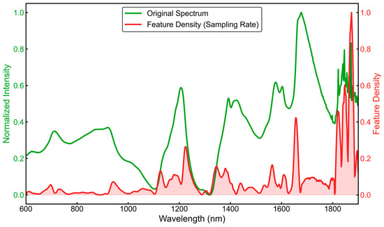 Relationship between spectral intensity and the learned feature-sampling density. The original spectrum (green) is shown together with the activation-derived feature density (red), which reflects how frequently local features are preserved after convolution and ReLU. Higher feature density appears around strong absorption peaks, indicating that the model allocates more sampling effort to informative spectral regions during denoising. (Qualitative observation only).
