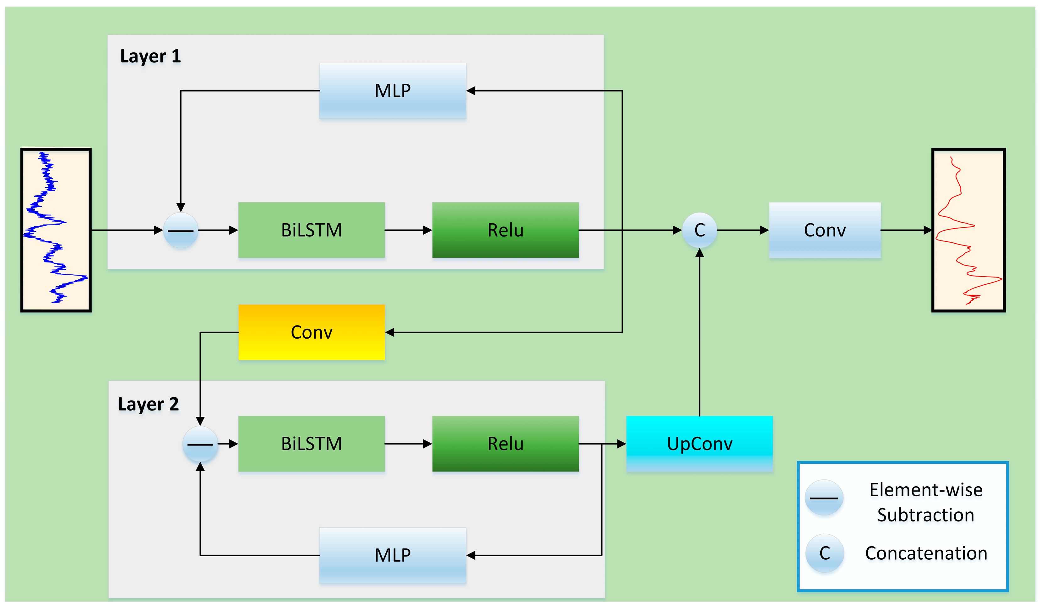 Building on this framework, we propose BiLSTM-FuseNet, a denoising architecture tailored to the NIR spectral structure. Unlike conventional AE or LSTM architectures that indirectly suppress noise, BiLSTM-FuseNet performs explicit residual noise estimation: a lightweight MLP branch learns a nonlinear mapping from the input spectra to the noise component, which is subsequently subtracted from the original input. In parallel, a bidirectional LSTM backbone captures global wavelength continuity, whereas a convolution–Bidirectional Long Short-Term Memory (BiLSTM) fusion path strengthens local spectral dependencies. This dual-path design enables the preservation of narrow functional absorption regions and the stabilization of broad baseline structures, yielding robust reconstructions even under mixed or correlated degradations. The main contributions of this study are as follows: