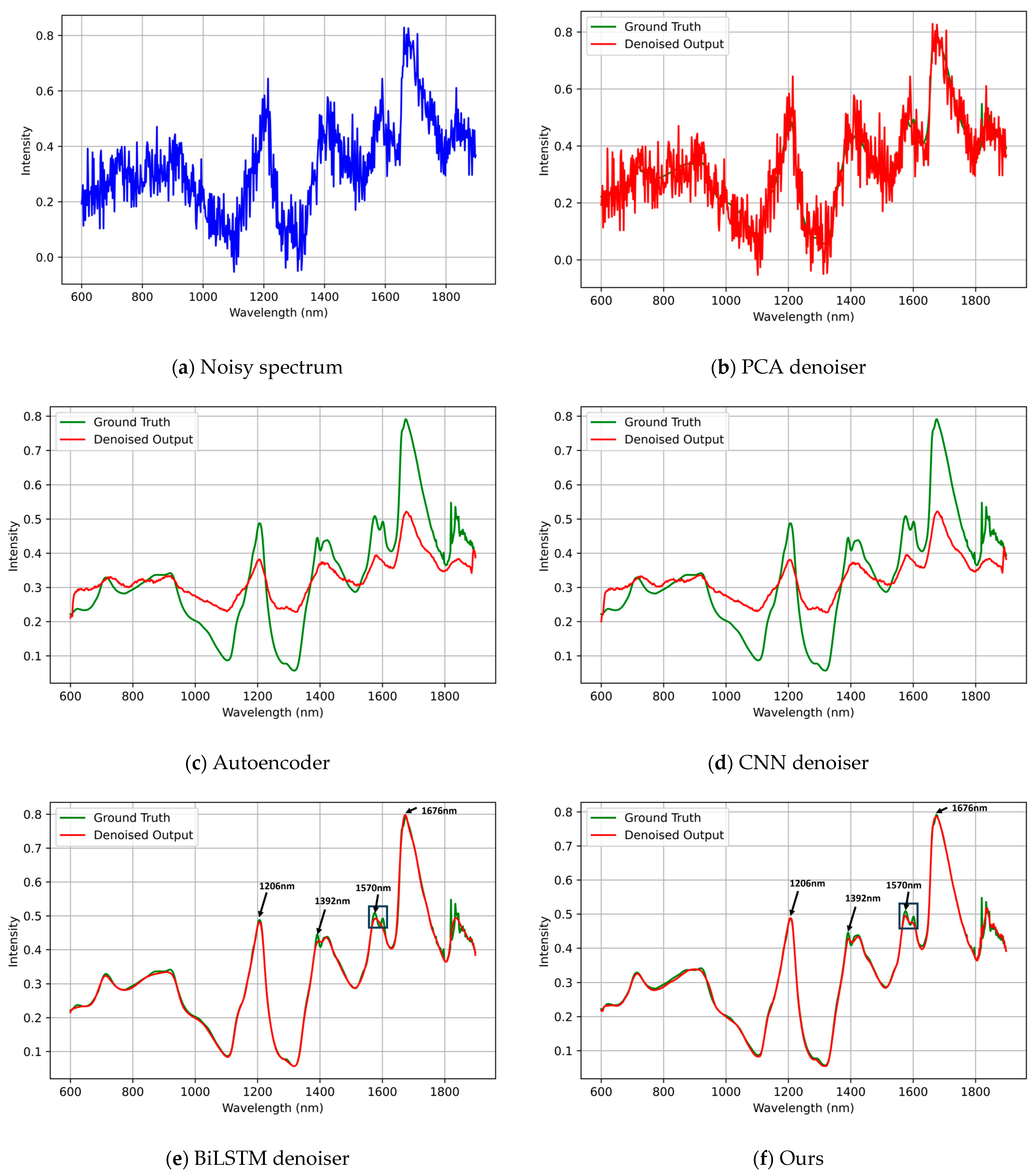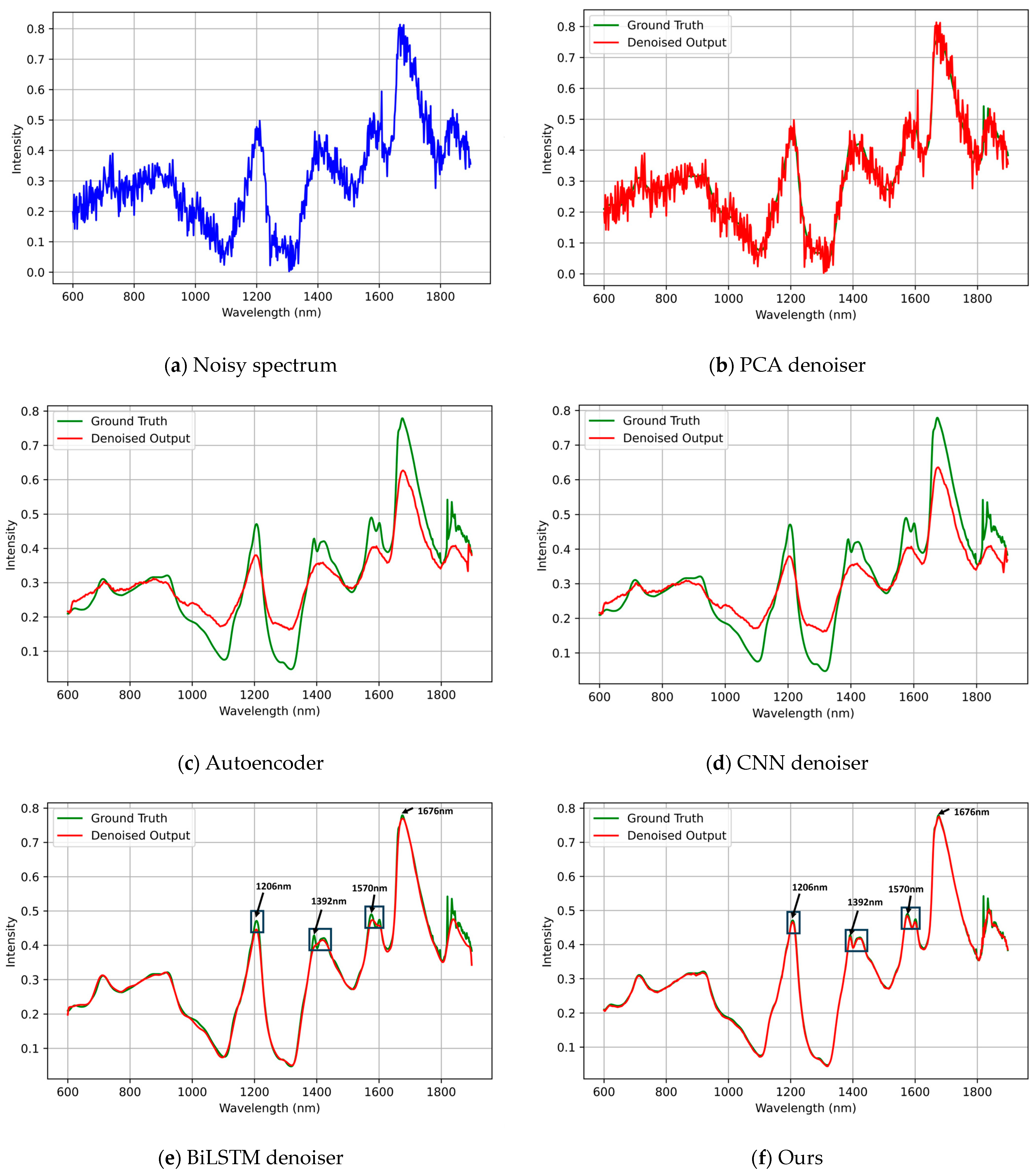 Figure 2, it can be observed that PCA denoising fails to reconstruct the spectral profile and leaves a considerable amount of residual noise. Autoencoder- and CNN-based denoisers suppress large fluctuations but oversmooth the signal, causing the loss of the characteristic absorption peaks. The BiLSTM denoiser captures most of the peak structures; however, compared with our proposed BiLSTM-FuseNet, it exhibits weaker reconstruction fidelity in chemically meaningful regions, particularly at approximately 1206, 1392, 1570, and 1676 nm. These wavelength regions are closely associated with fundamental physicochemical absorptions in the NIR domain: 1200–1400 nm corresponds to the overtone absorption of C–H and N–H bonds; 1400–1600 nm corresponds to the second overtone of O–H stretching; and 900–1100 nm is influenced by polysaccharide-related scattering and matrix effects. In contrast, BiLSTM-FuseNet preserves both the global spectral trend and fine peak–valley structures in these chemically relevant regions, indicating that global temporal modeling combined with local feature extraction enables the network to recover physically meaningful spectral information rather than merely smoothing noise.