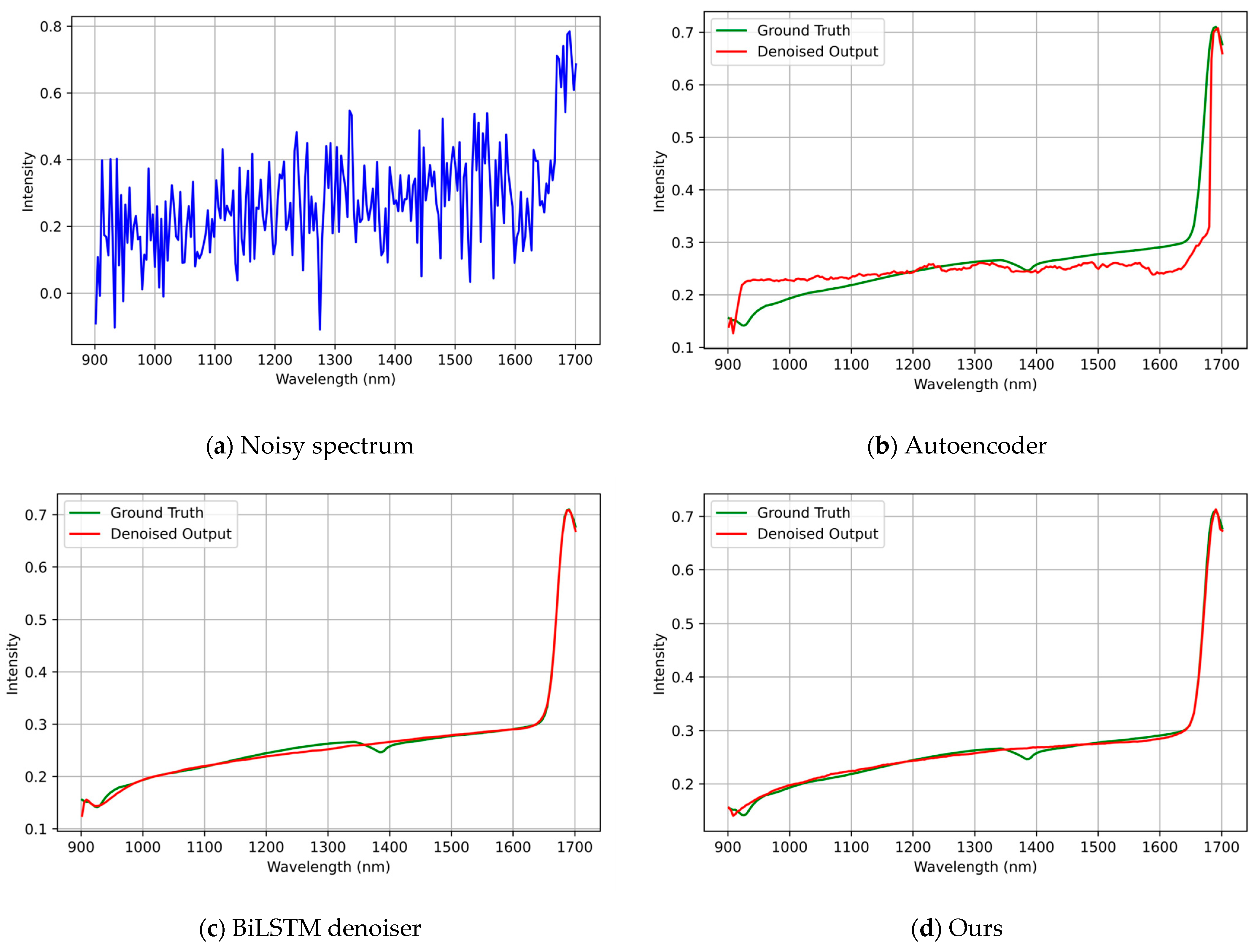 Figure 4, the spectra contained very few sharp peaks and primarily exhibited smooth broadband variations. In this case, the autoencoder tends to oversmooth the curve and deviates noticeably from the reference. By contrast, both the BiLSTM denoiser and BiLSTM-FuseNet maintained the overall spectral shape well. Overall, BiLSTM-FuseNet provides the closest match to the ground truth, reflecting a better preservation of the global spectral trend.
